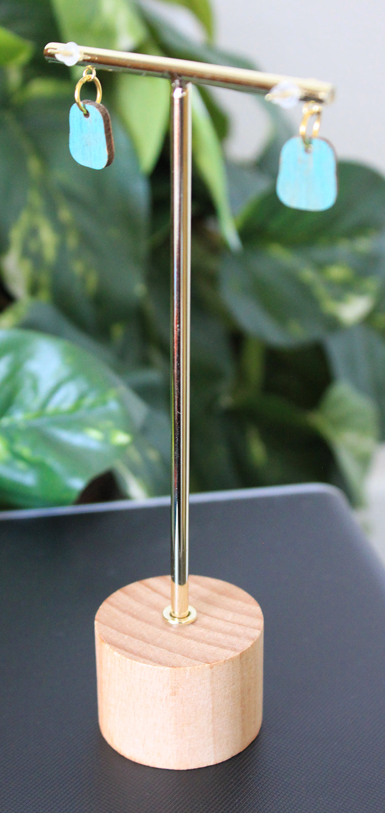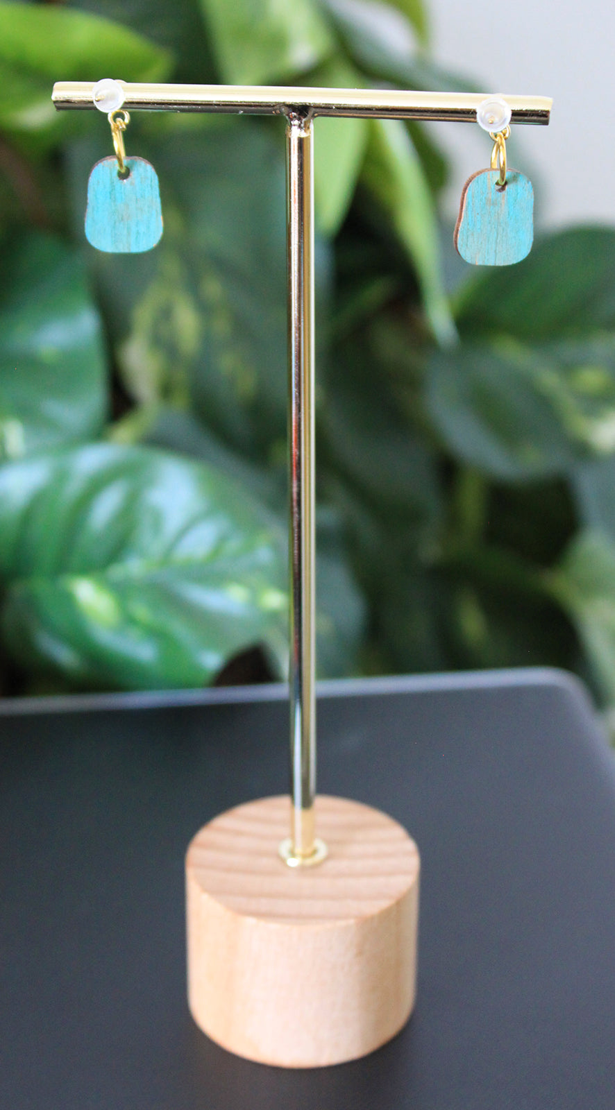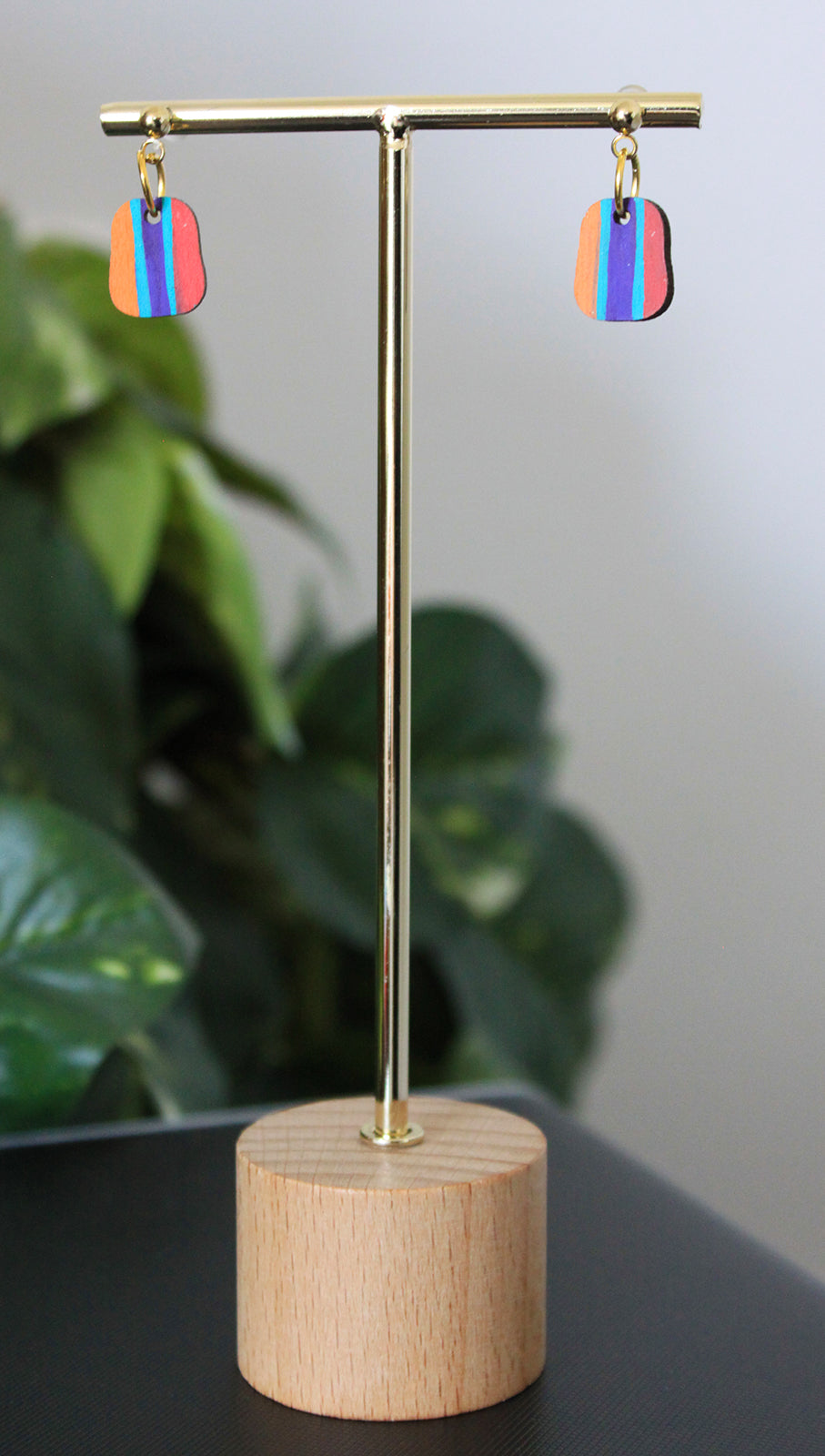 Light weight handmade earring with painted linear rainbow design. The four colors of the rainbow design are orange, teal, purple and red. These earrings are artistically playful. The back side is painted bright teal as to provide contrast. These are fun 'little' addition to your daily wear!