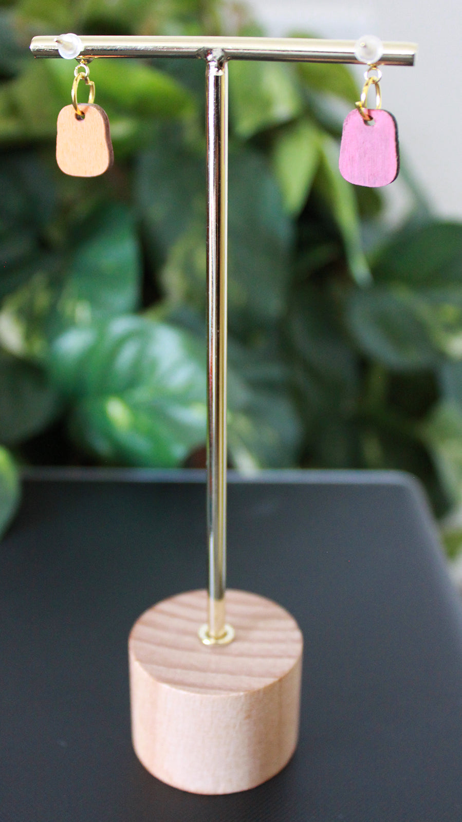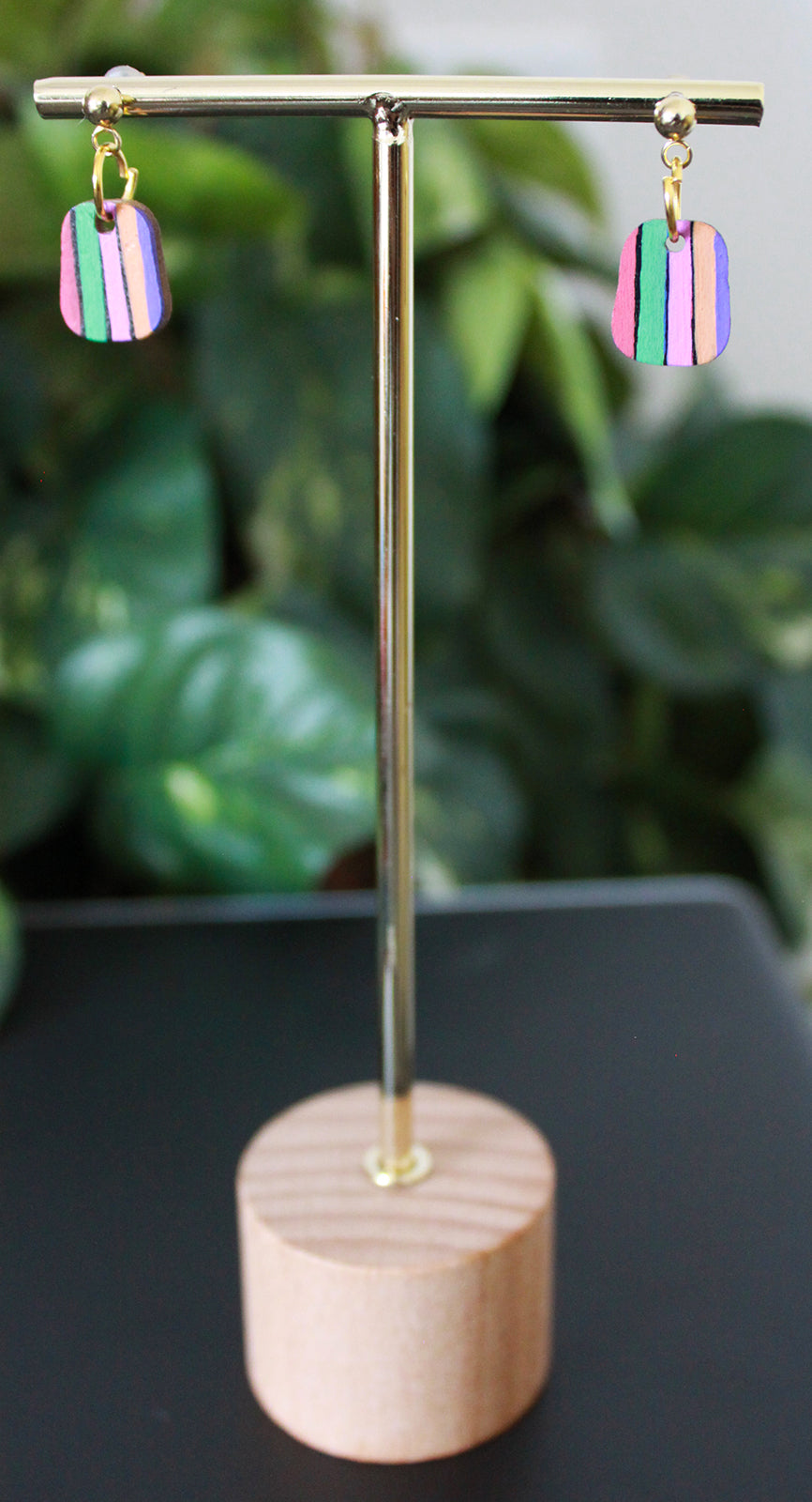 Light weight handmade earring with painted linear rainbow design. The five colors of the rainbow design are pinkish red, light green, pink, orange and purple. These earrings are artistically playful. One back side is painted in pinkish red, and the other is painted in orange to provide a contrast. These are fun 'little' addition to your daily wear!