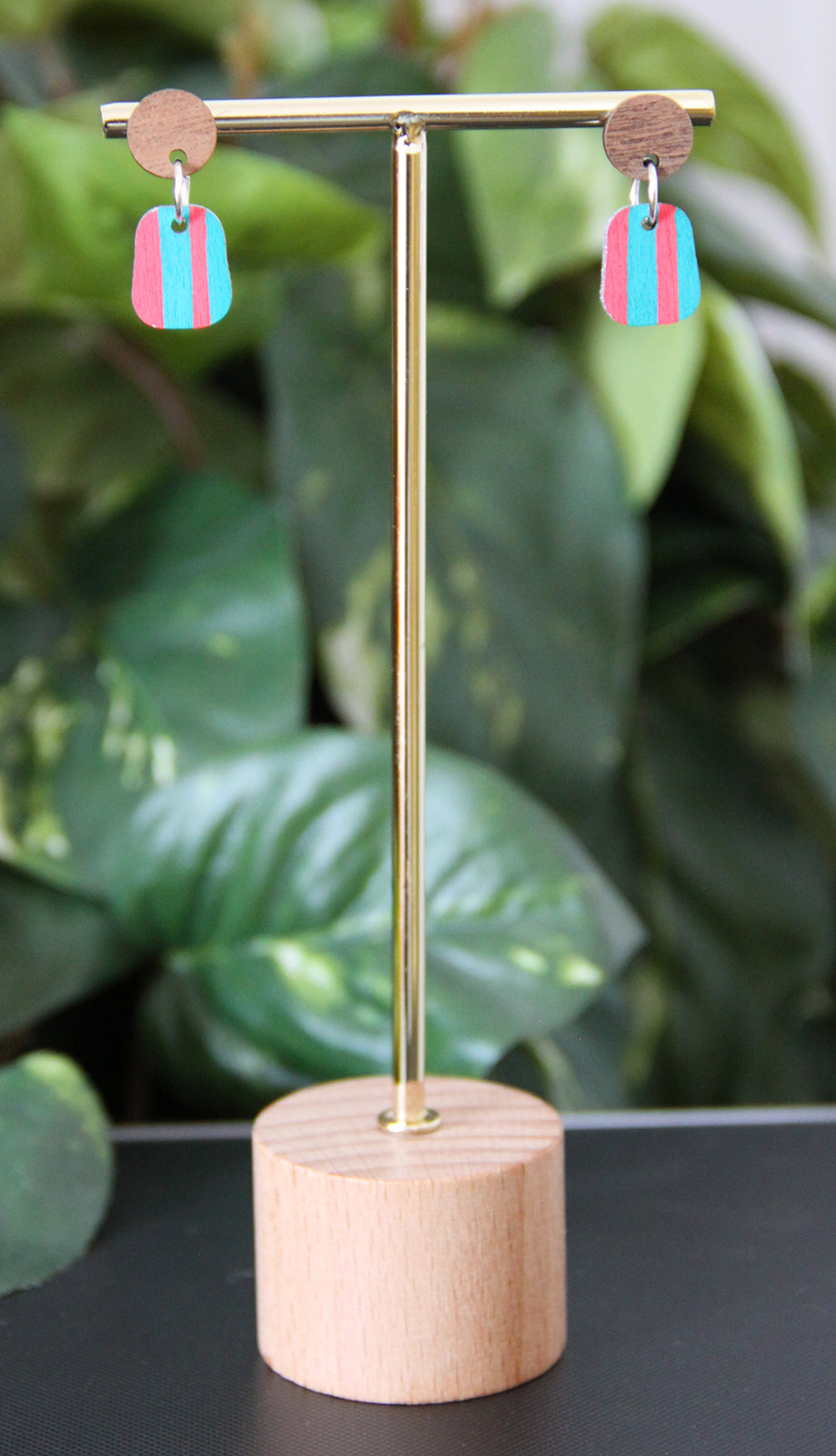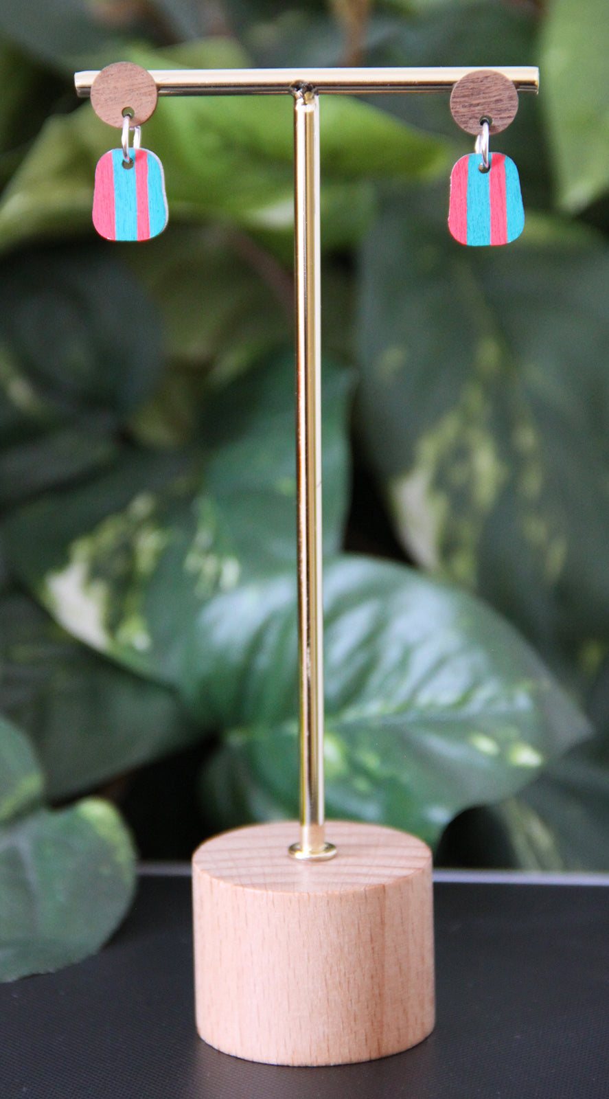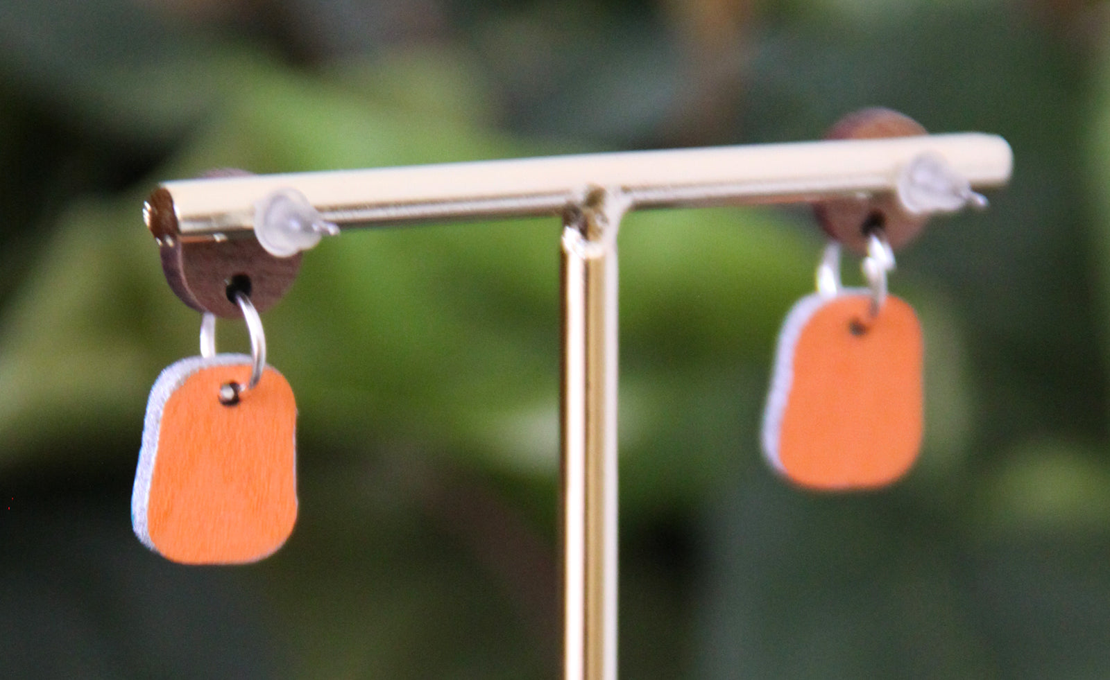 Light weight handmade earring with painted linear design. The red and teal color creates a fun look. These earrings are artistically playful. The back side is painted bright orange as to provide contrast. Edges are painted silver. These are fun 'little' addition to your daily wear!
