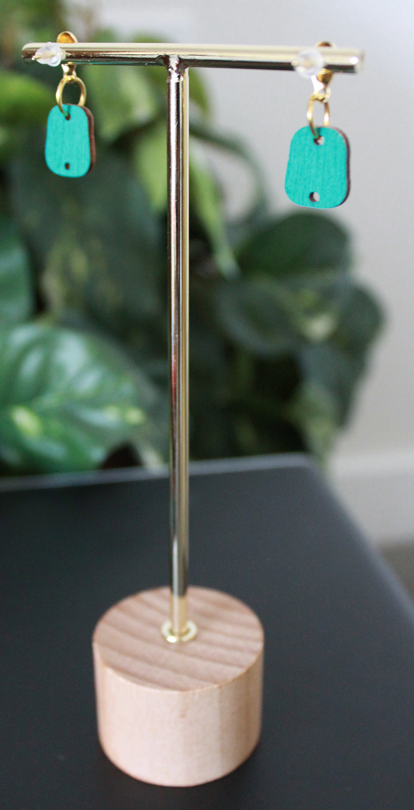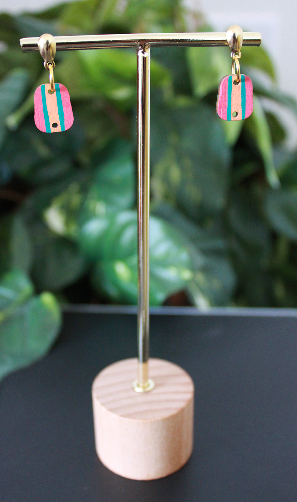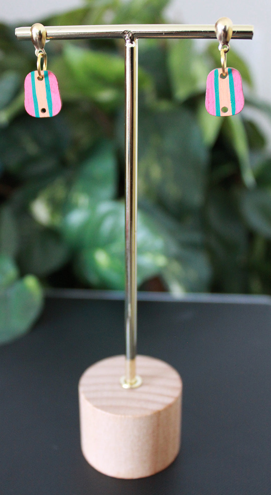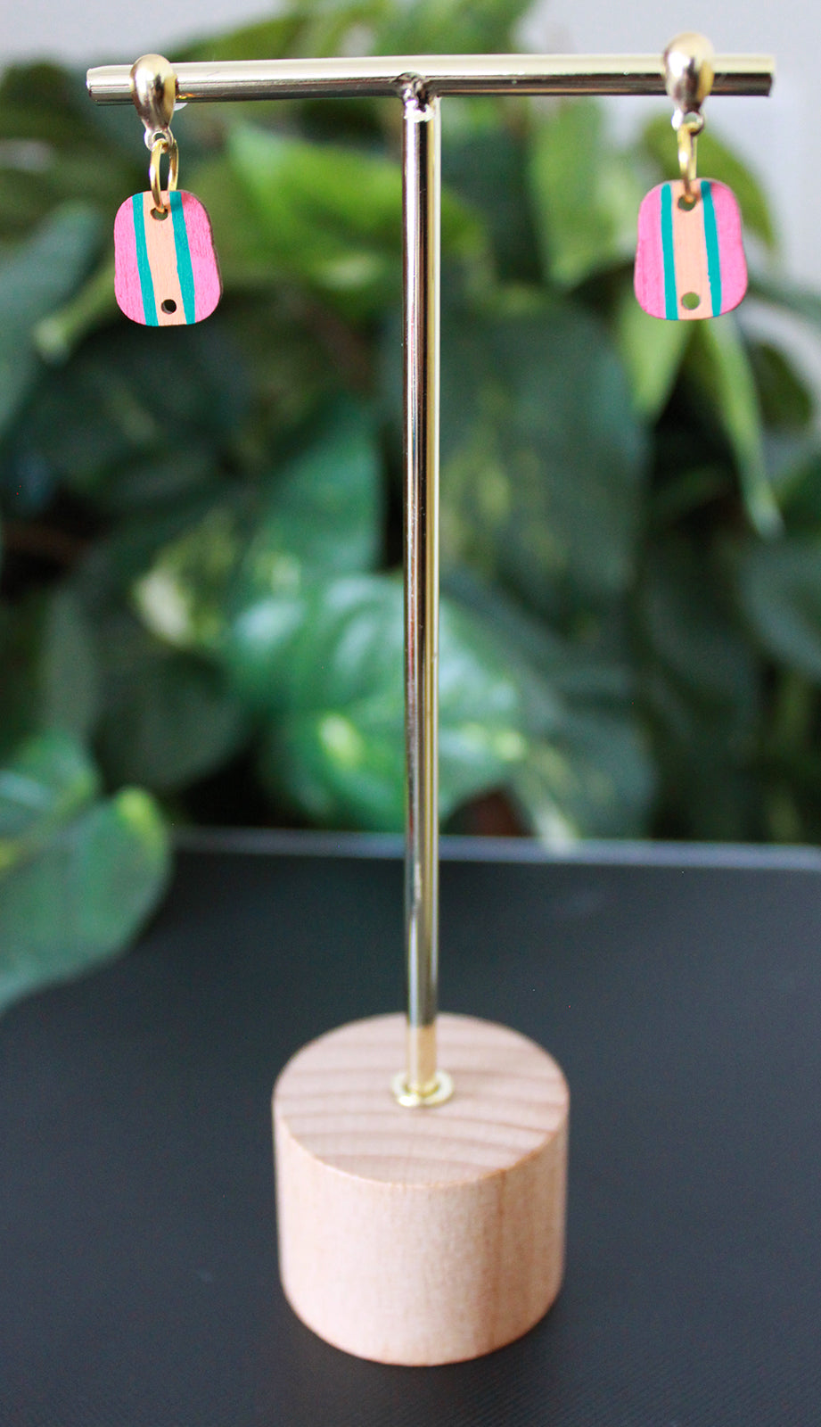 Light weight handmade earring with painted linear rainbow design. The four colors of the rainbow design are blue, red, teal and yellow. These earrings are artistically playful. The back side is painted bright teal (turquoise) as to provide contrast. These are fun 'little' addition to your daily wear!