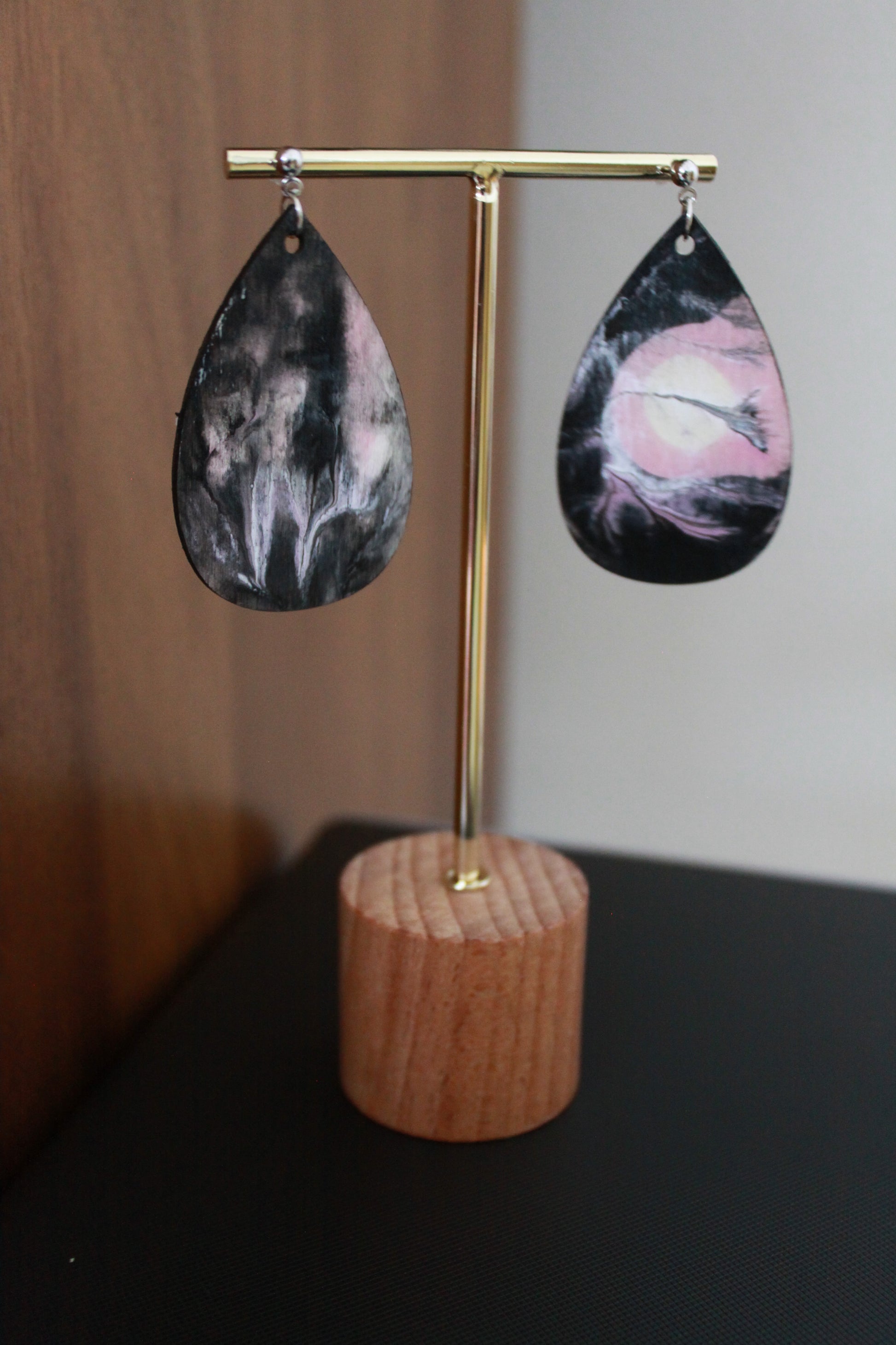 Light weight handmade earring with marbled black, pink, off-white and white pattern on wood. The back side is the bare wood as to provide contrast. There will be slight variations in the marbled pattern as each piece is hand crafted.