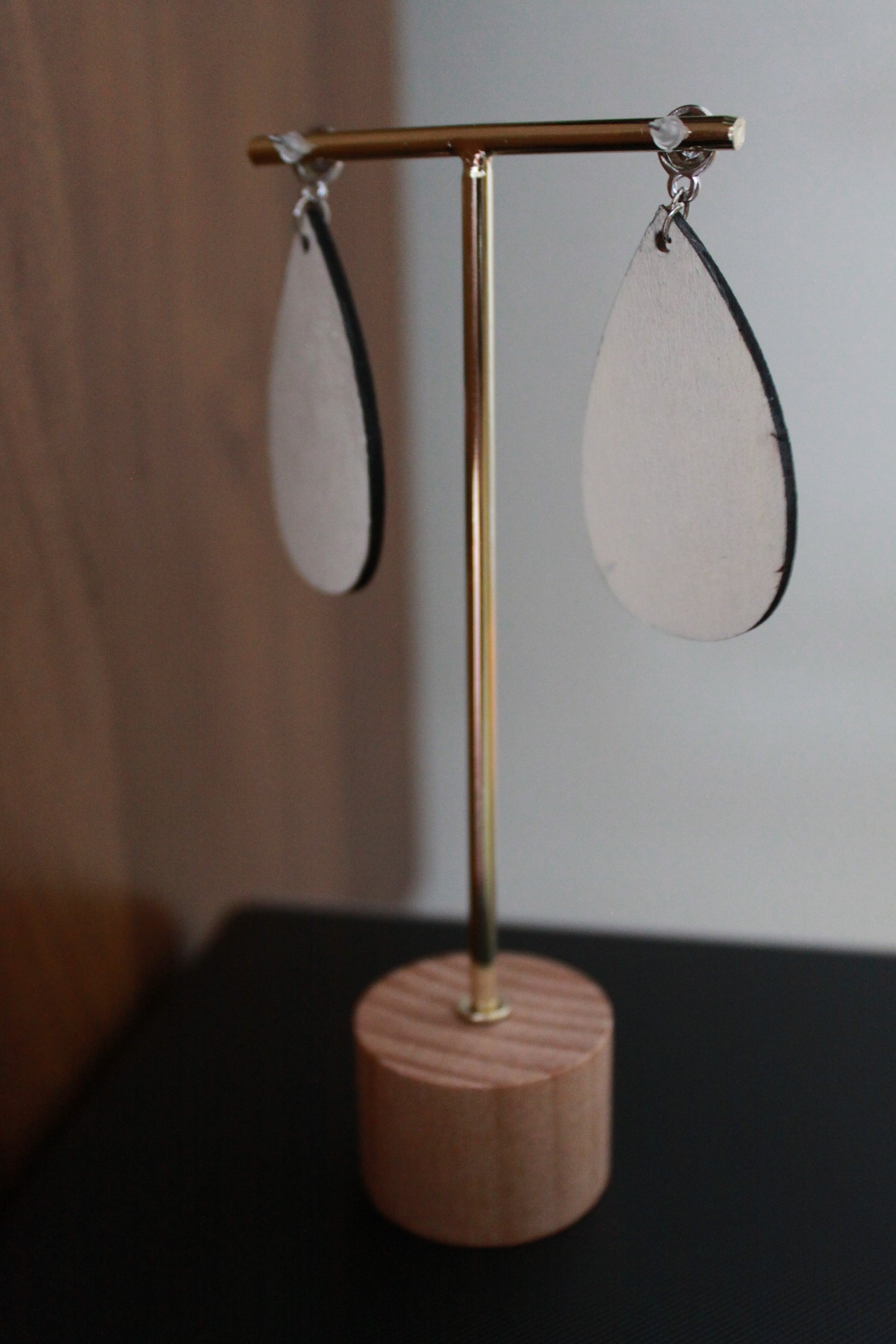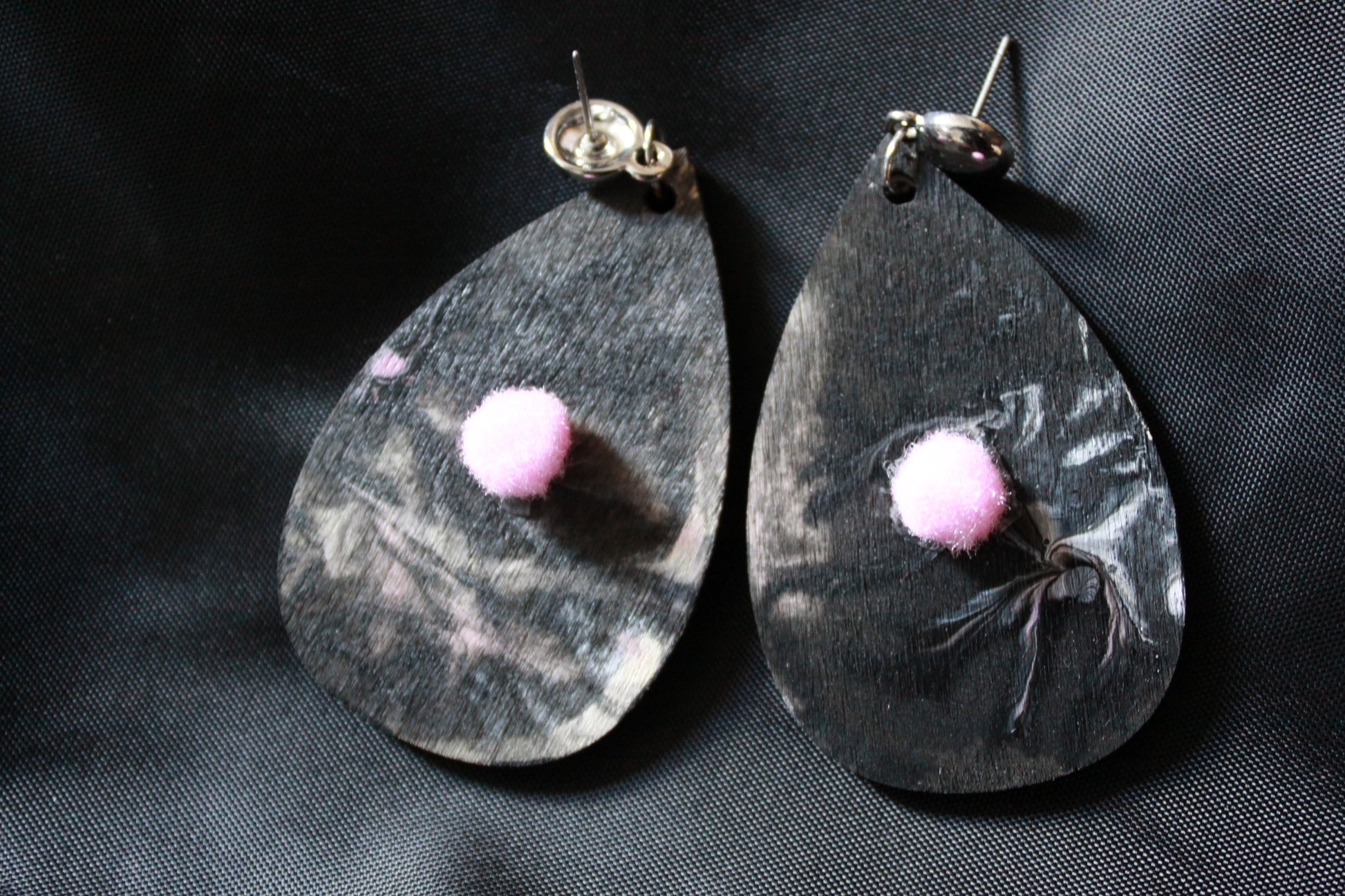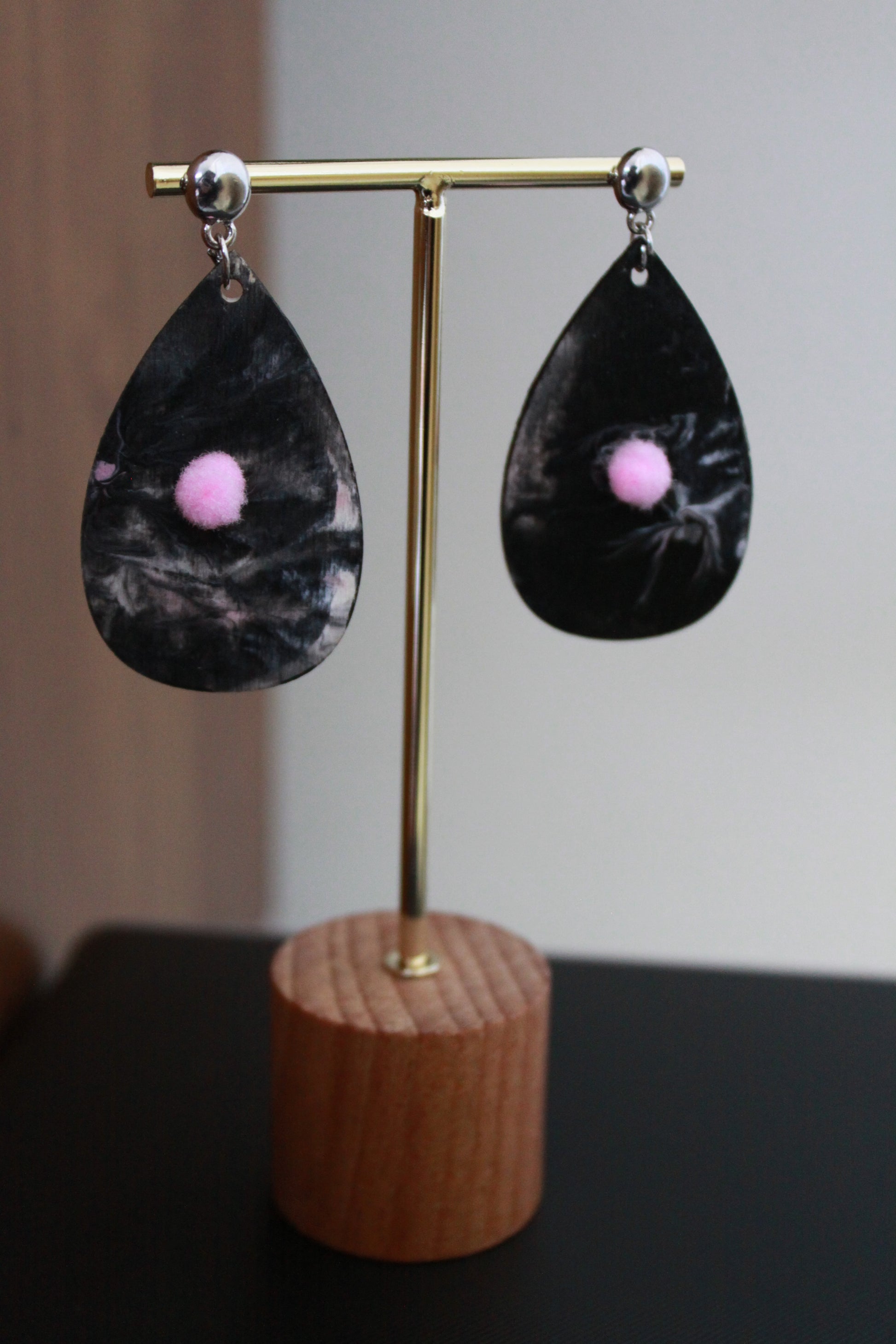 Light weight handmade earring with marbled black, pink, off-white and white pattern on wood. The back side is the bare wood as to provide contrast. The pink-colored pom pom adds fun to the daily wear. There will be slight variations in the marbled pattern as each piece is hand crafted.