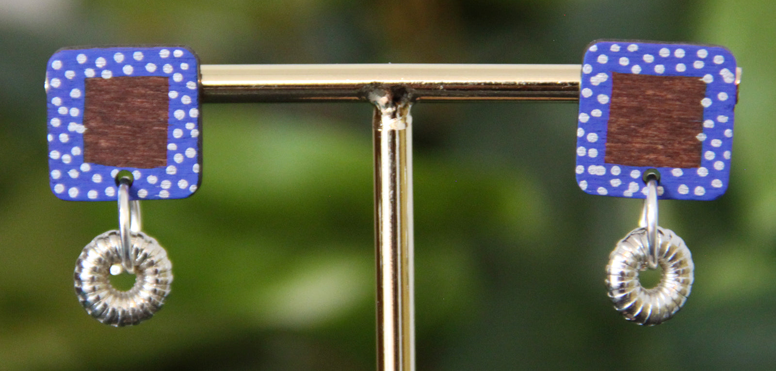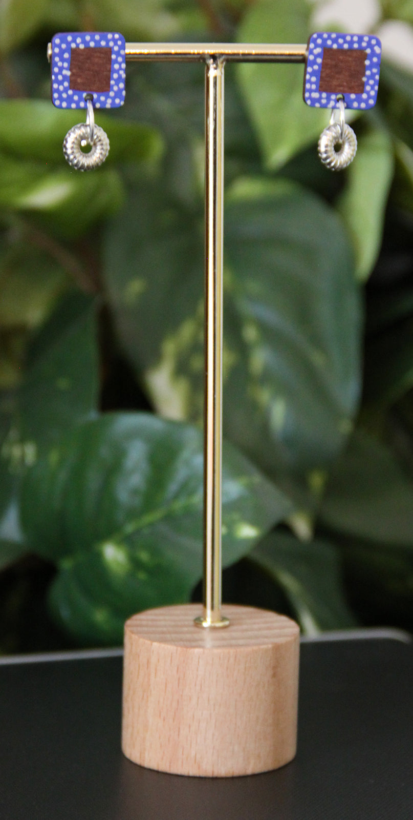 Light weight handmade earring with painted classical polka dots design. Blue with white polka dots creates a fun look. Small silver textured bead dangling at the bottom creates a dramatic look. These earrings are artistically playful. The back side is the bare wood as to provide contrast. There will be slight variations in the painted pattern as each piece is hand crafted. These are fun 'little' addition to your daily wear!
