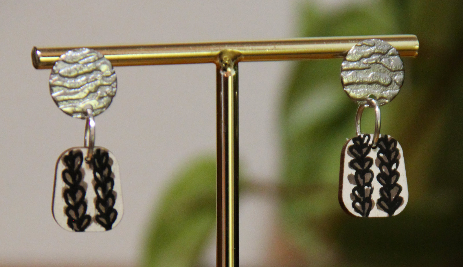 Light weight handmade earring with painted floral design. The dark brown with black outlined design stands out on a warm, white-colored base. These earrings are artistically playful. The back side is painted dark brown as to provide contrast. These are fun 'little' addition to your daily wear!