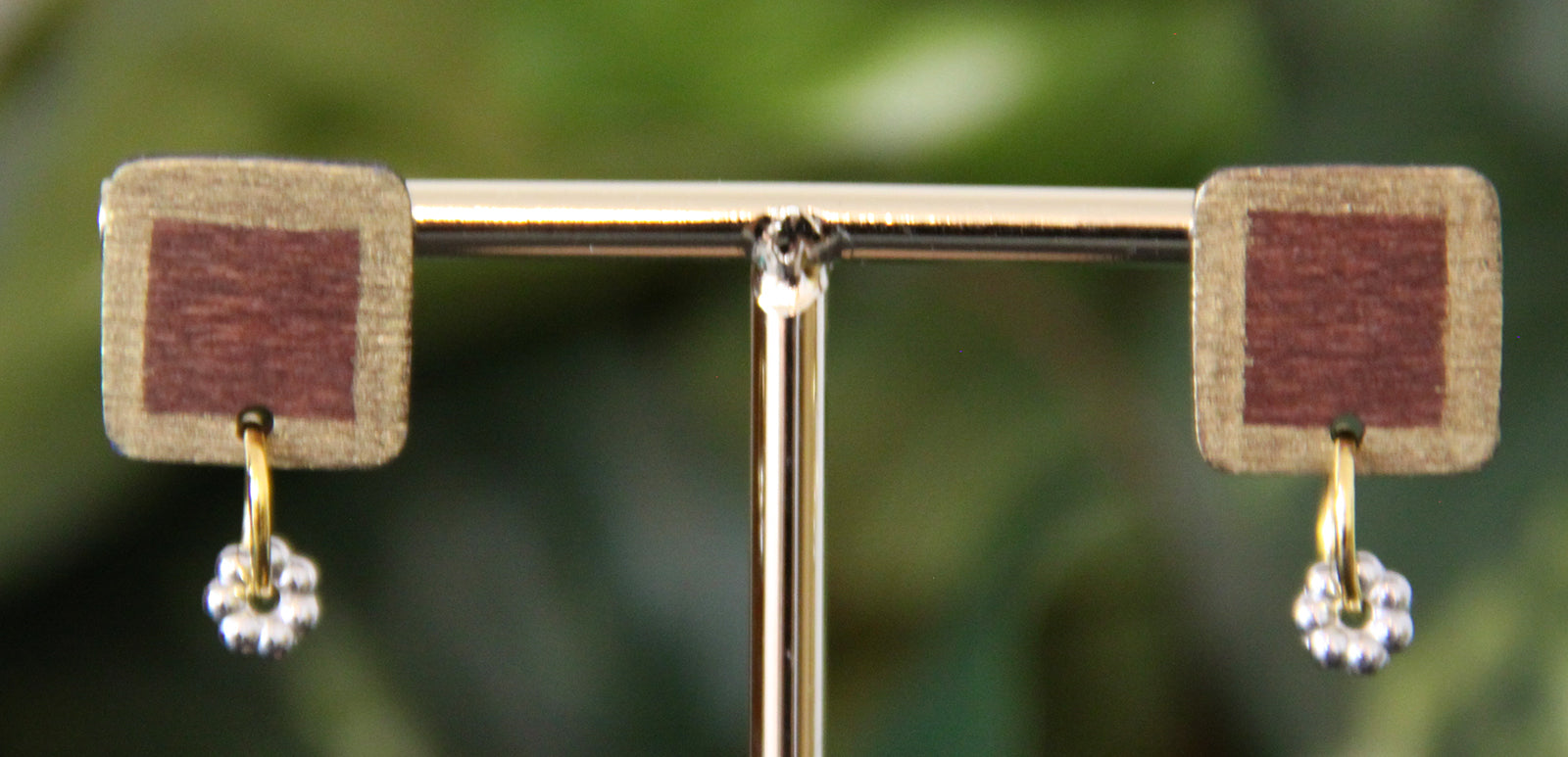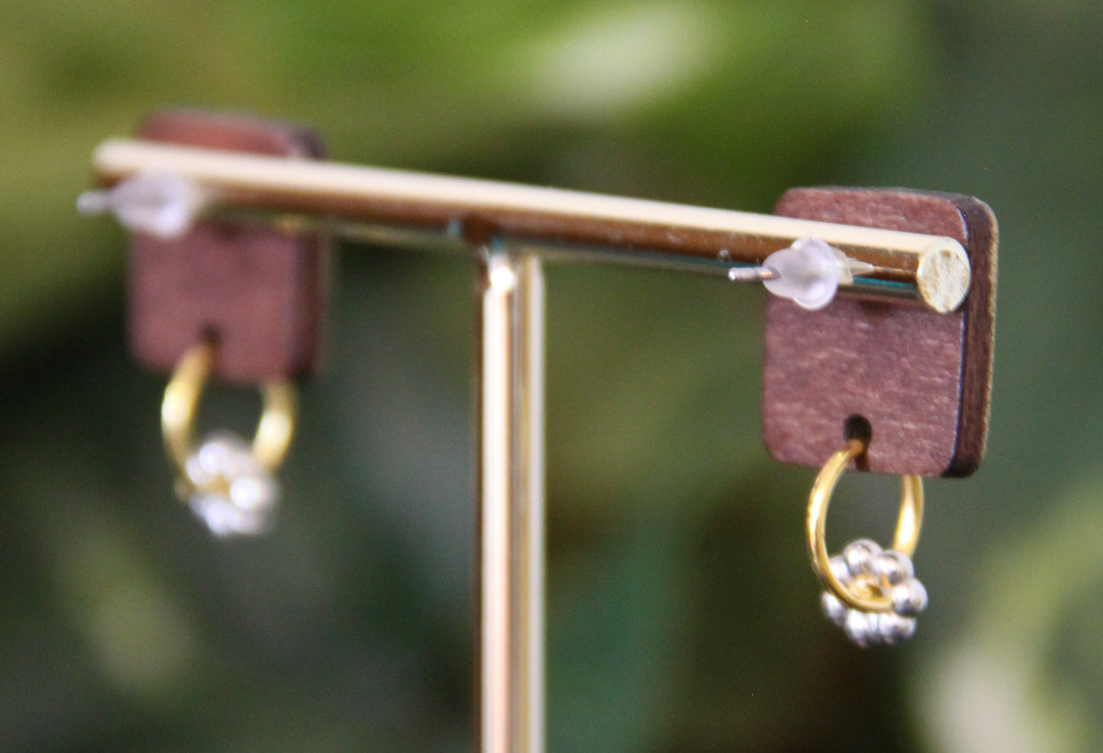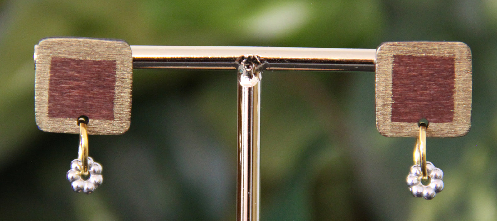 Light weight handmade earring with classical gold linear design. Gold paint accentuates the squarish shape of the earring. Small silver flower bead dangling at the bottom creates a fun look. These earrings are artistically playful. The back side is the bare wood as to provide contrast. There will be slight variations in the painted pattern as each piece is hand crafted. These are fun 'little' addition to your daily wear!