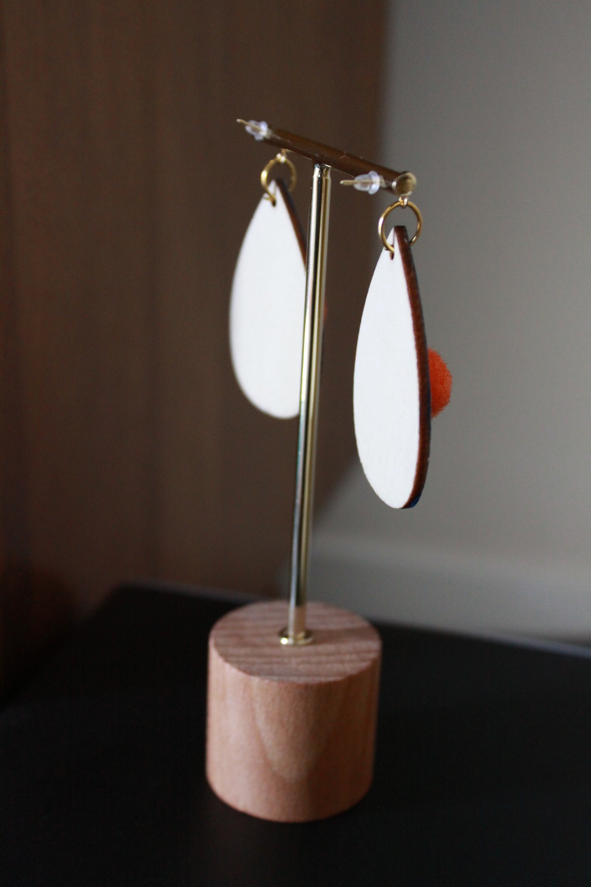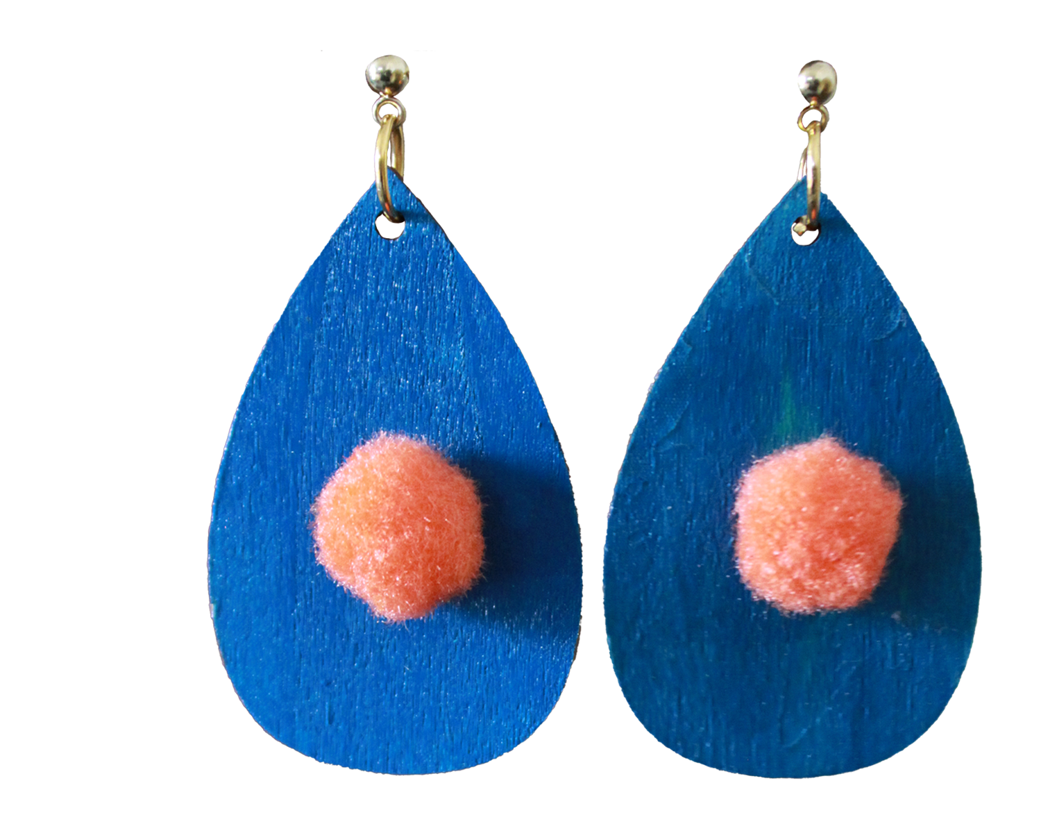 Light weight handmade earring with bright bluish teal color. The vibrant orange colored pom-pom adds fun to the daily wear. The back side is the bare wood as to provide contrast.