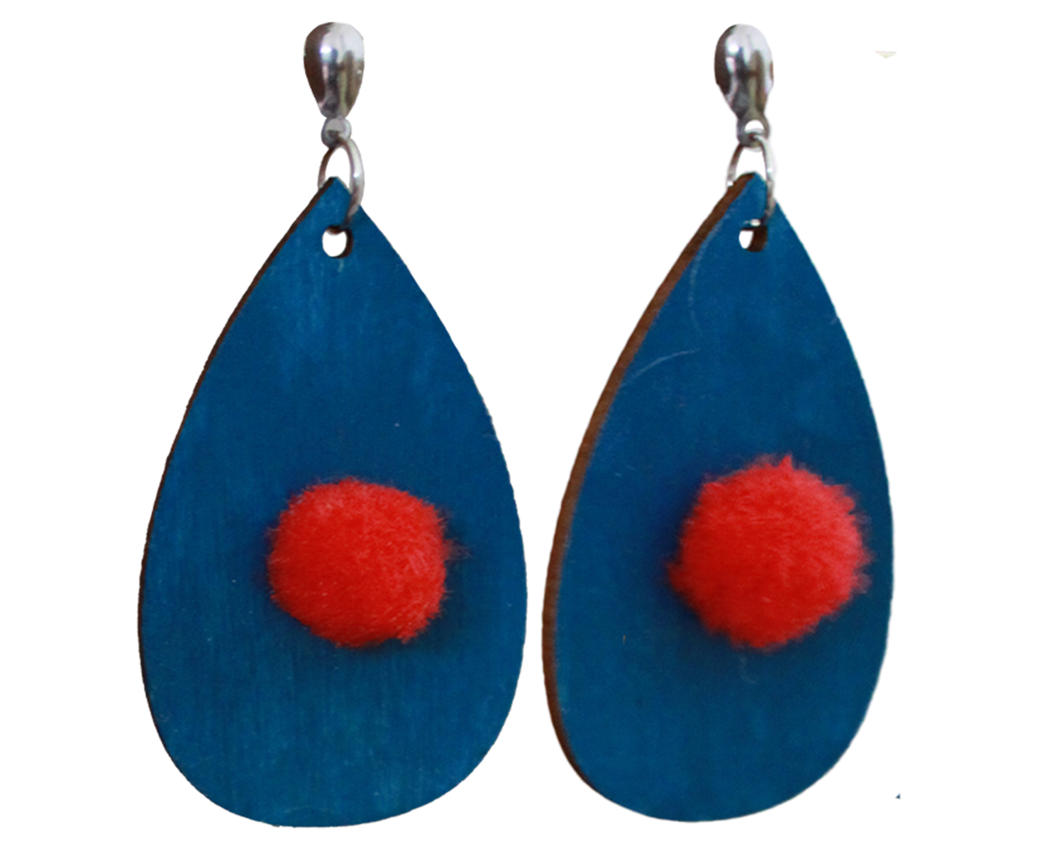Light weight handmade earring with bright bluish teal color. The vibrant red colored pom-pom adds fun to the daily wear. The back side is the bare wood as to provide contrast.