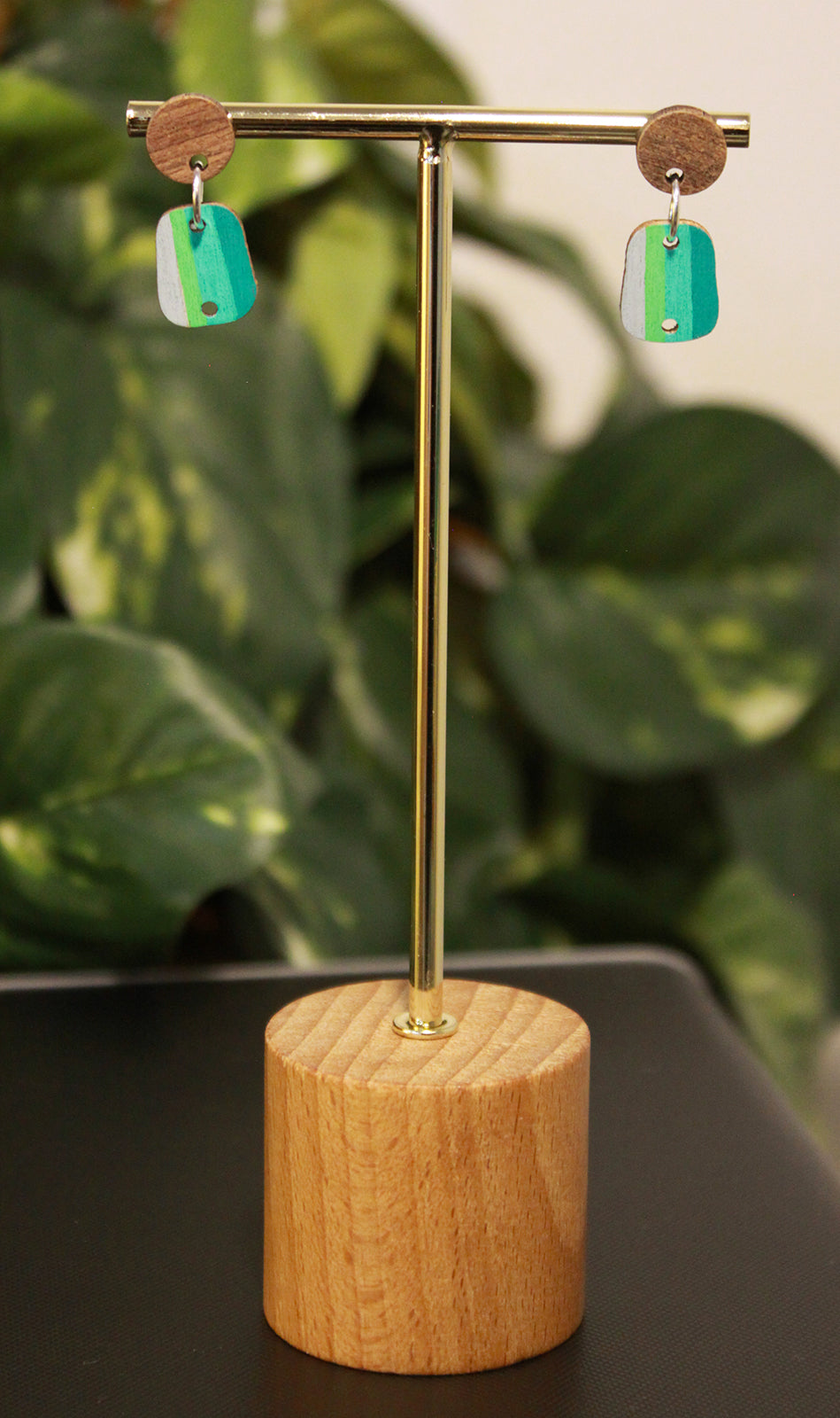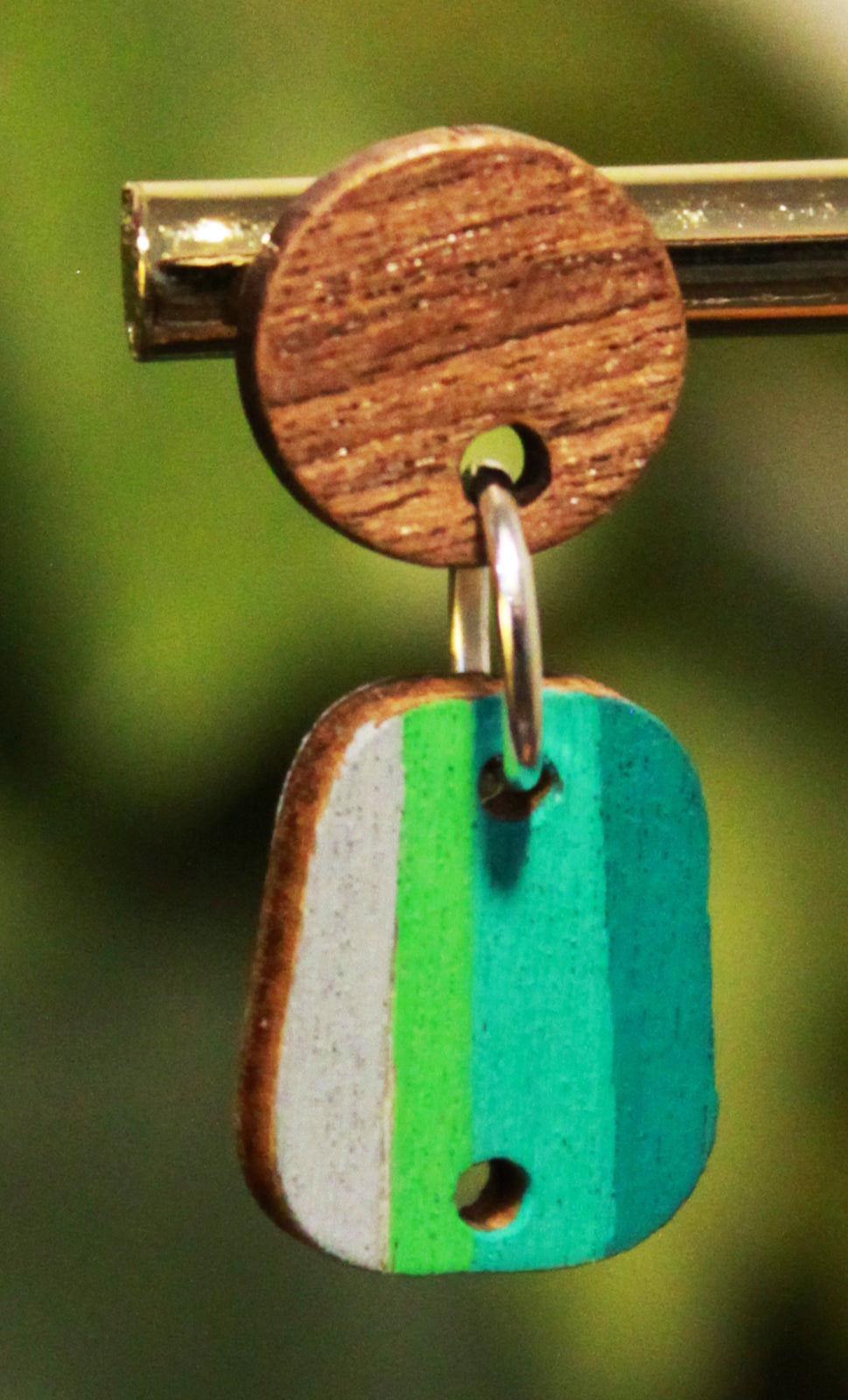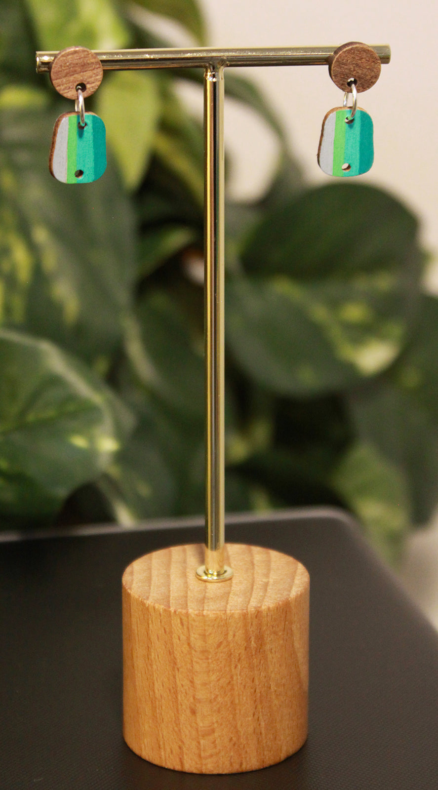 Light weight handmade earring with painted linear design. The four colors of the linear design are dark teal blue, light teal blue, light green and silver. These earrings are artistically playful. The back side is painted grey as to provide contrast. These are fun 'little' addition to your daily wear!