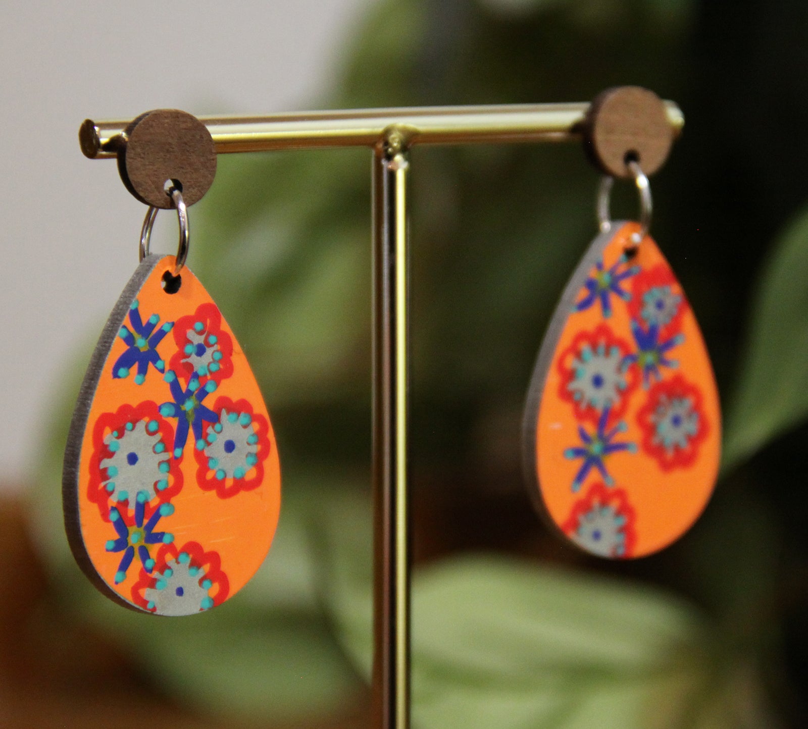 Light weight handmade earring with painted floral design - orange, red, blue, gold and silver create an artistically playful look. The back side is left bare and is glossy white in finish. Edges are painted in bright silver as to provide contrast. There will be slight variations in the painted pattern as each piece is hand crafted. These earrings are an absolute showstopper and conversation-starter!