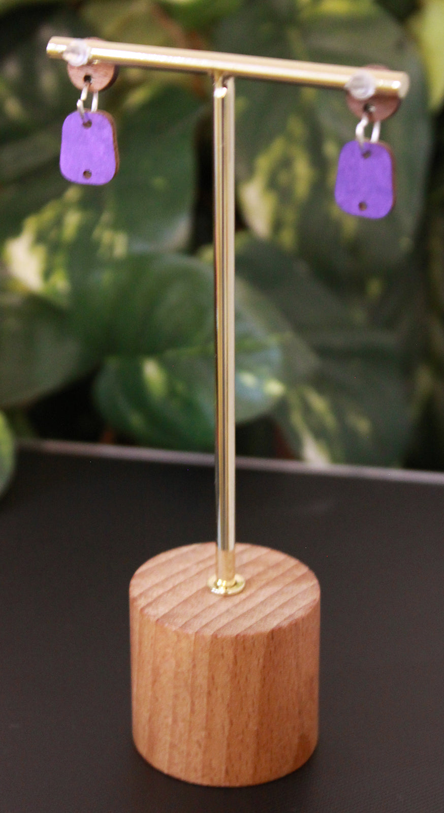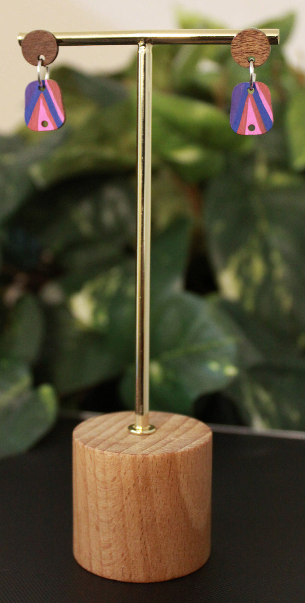 Light weight handmade earring with painted diagonal linear design. The abstract linear design is marked by purple, blue, red and pink colors. These earrings are artistically playful. The back side is painted purple as to provide contrast. These are fun 'little' addition to your daily wear!