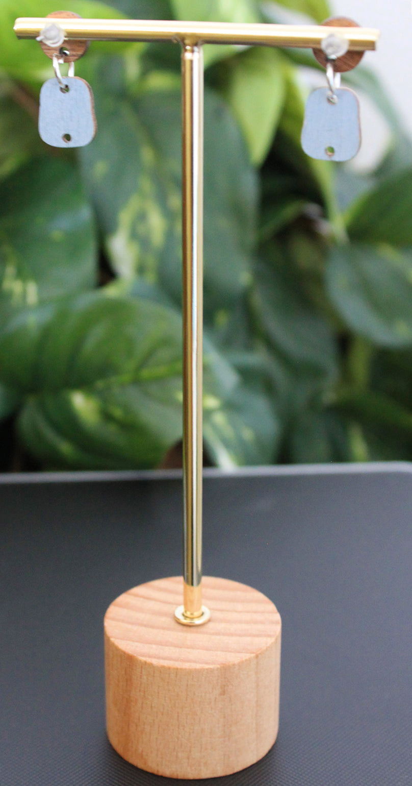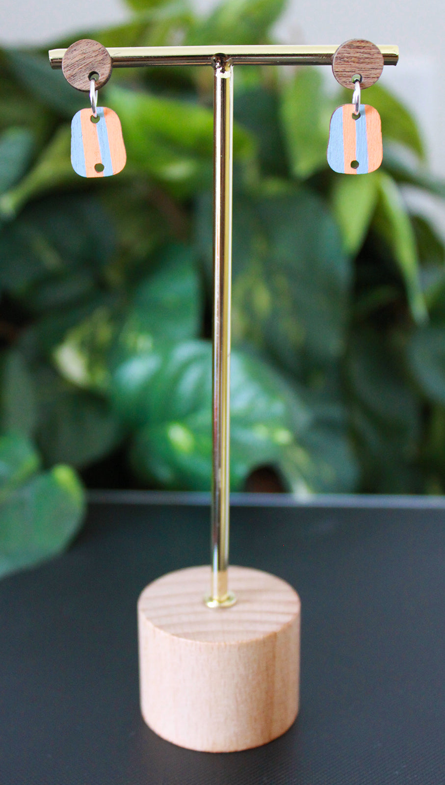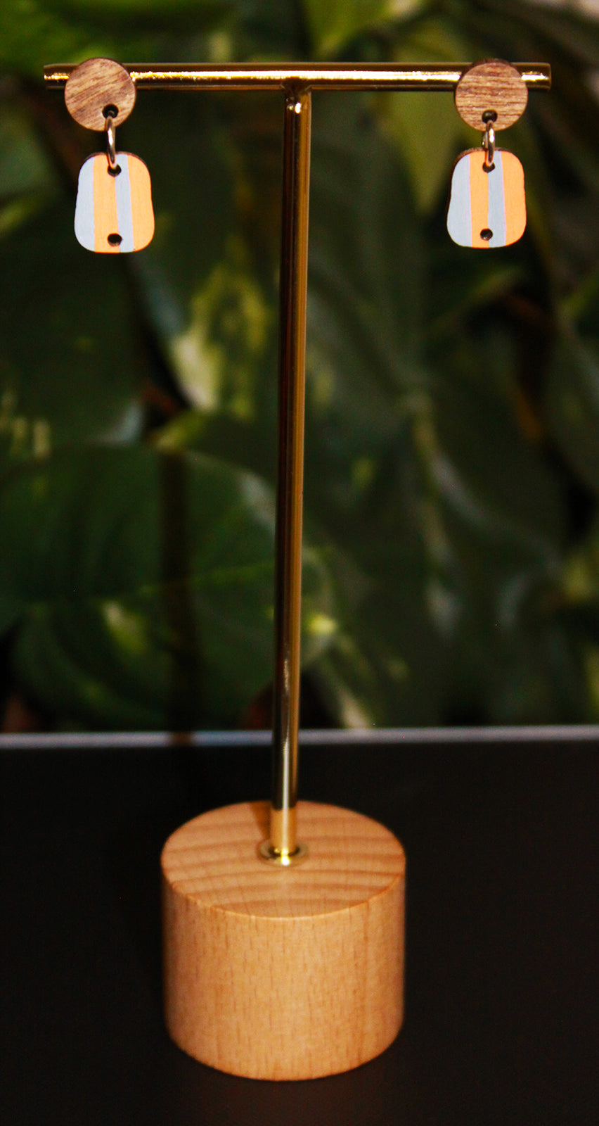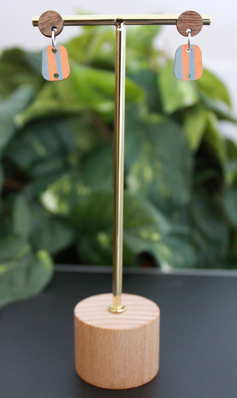 Light weight handmade earring with painted linear design. The linear design is marked with two colors: orange and grey. These earrings are artistically playful. The back side is painted grey as to provide contrast. These are fun 'little' addition to your daily wear!