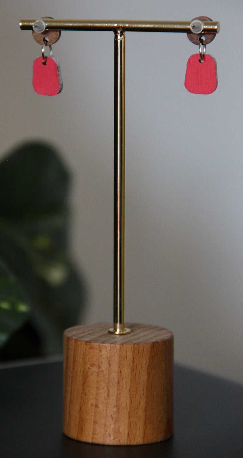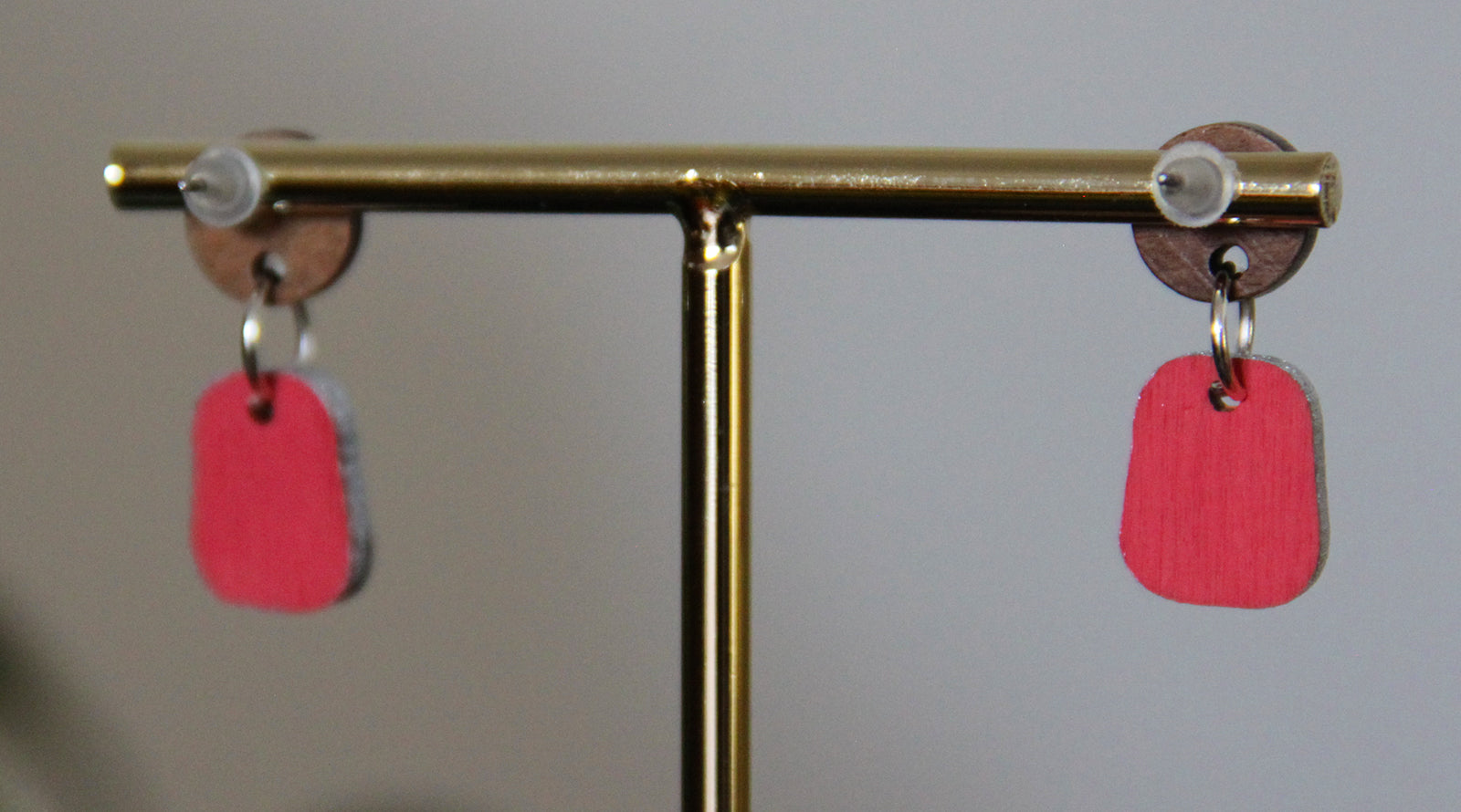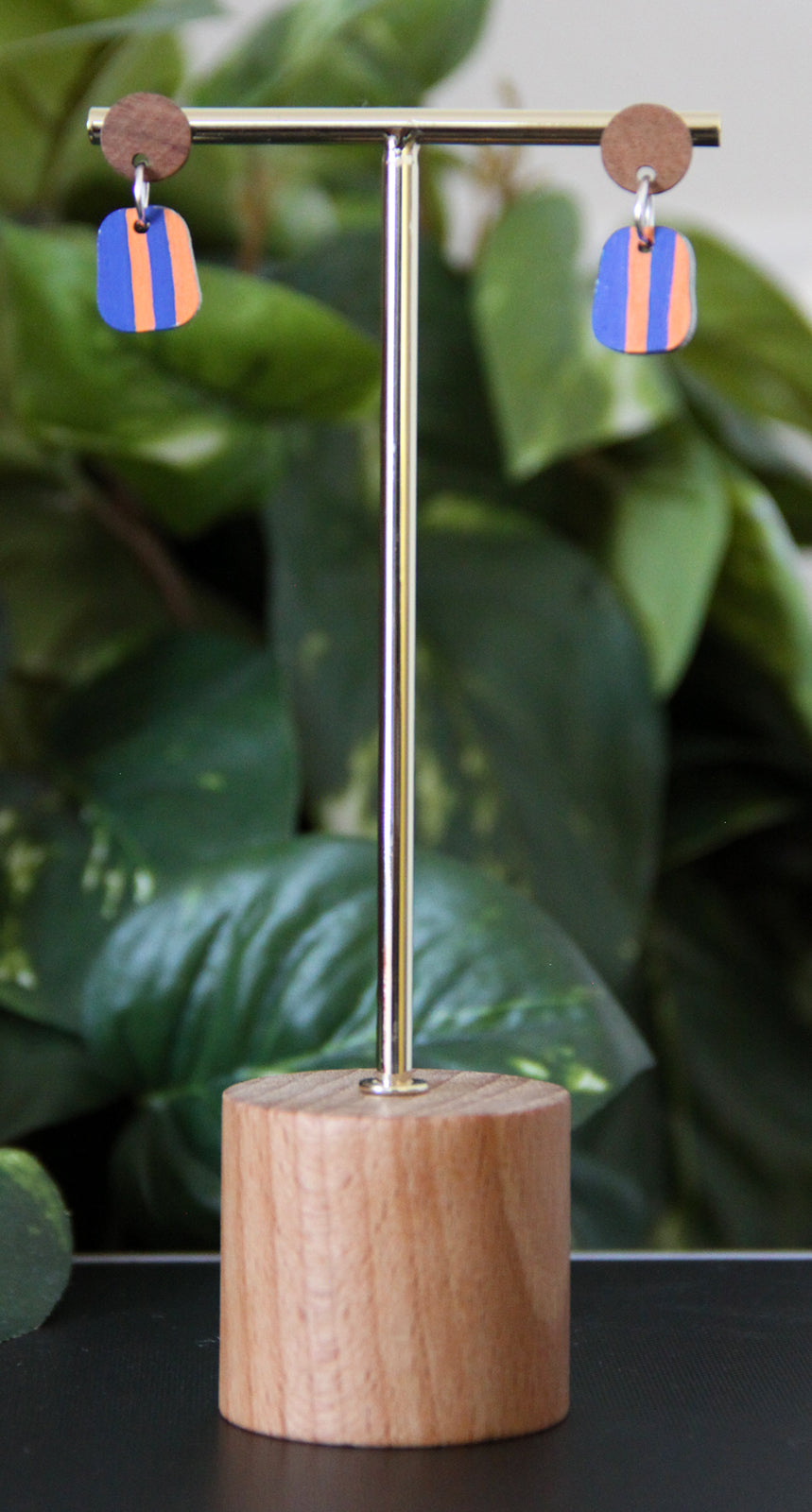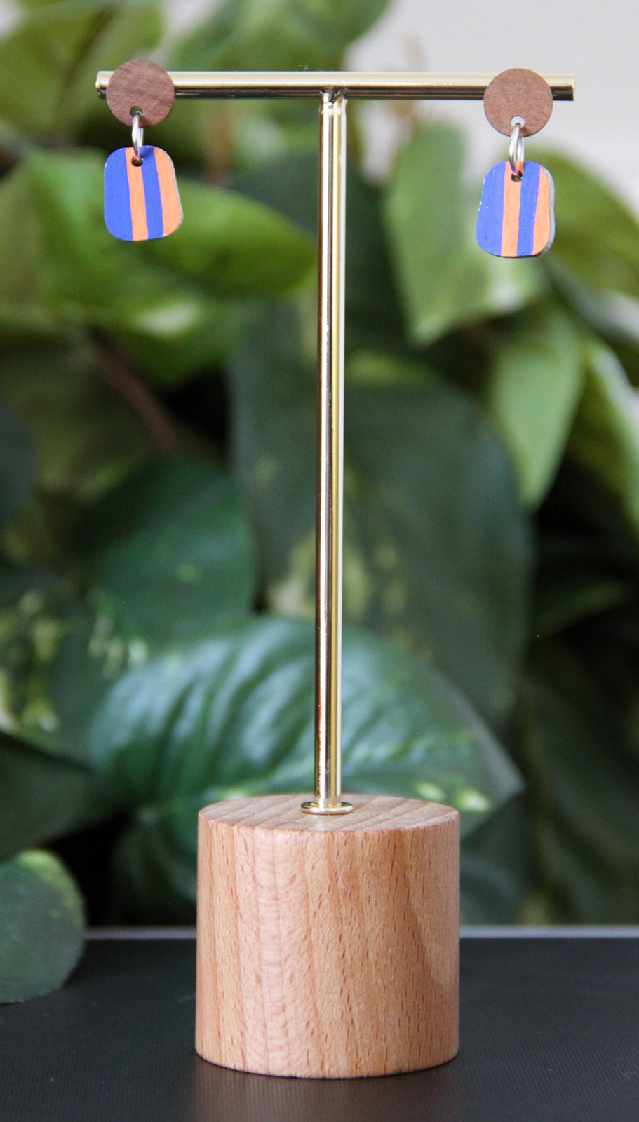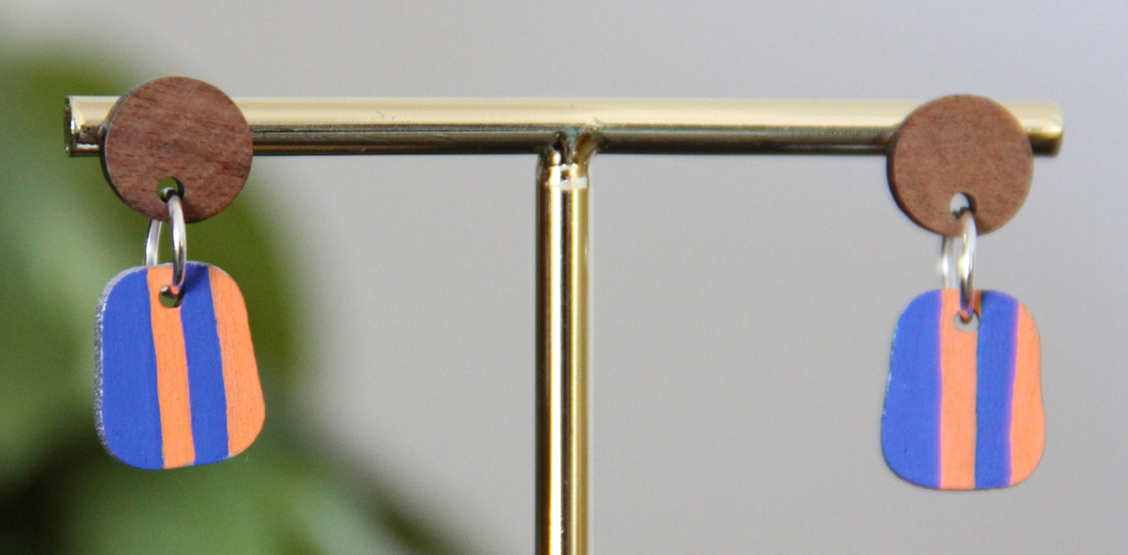 Light weight handmade earring with painted linear design. The blue and orange color creates a fun look. These earrings are artistically playful. The back side is painted bright red as to provide contrast. Edges are painted silver. These are fun 'little' addition to your daily wear!