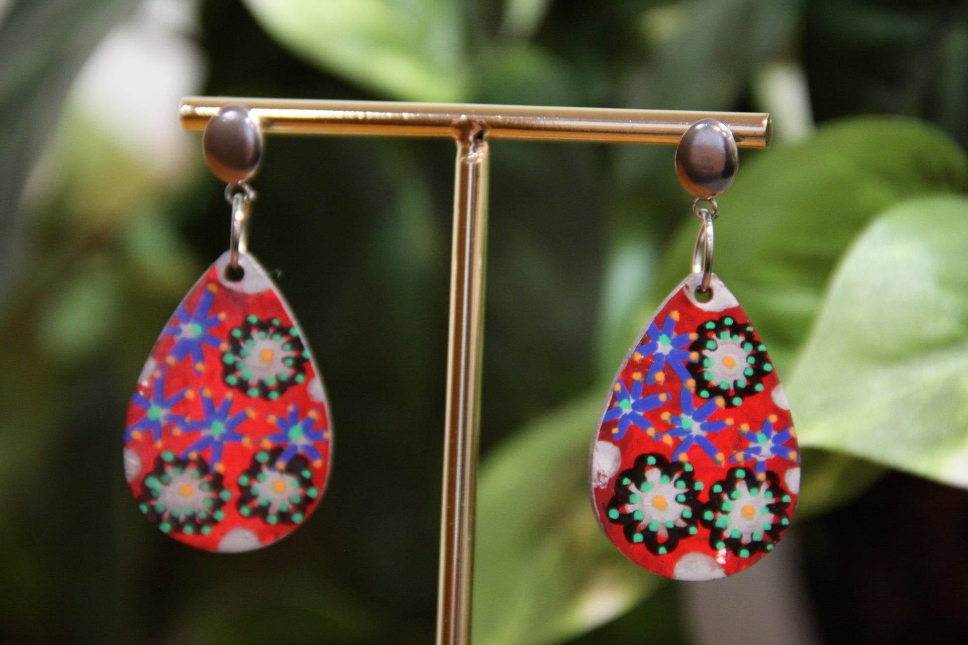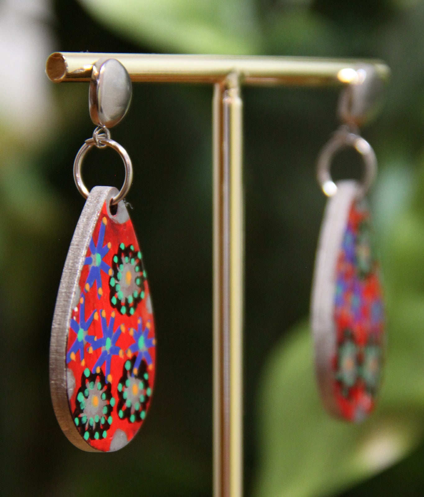 Light weight handmade earring with painted floral design - orange, red, blue, cyan and silver create an artistically playful look. The back side is painted in silver color. Edges are painted in bright silver as to provide contrast. There will be slight variations in the painted pattern as each piece is hand crafted. These earrings are an absolute showstopper and conversation-starter!