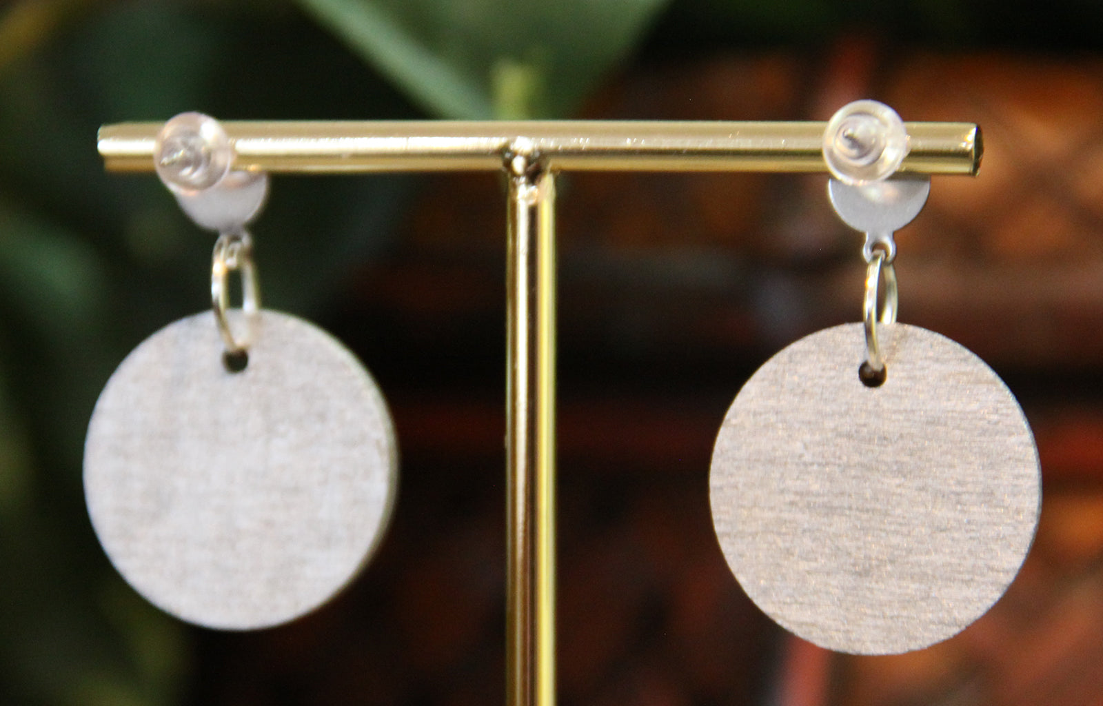 Light weight handmade earring with painted intricate geometrical design - dark grey, light grey, silver and black painted in abstract hypnotic striking design. The main design consists of a series of squares, each outlined in silver and black. These earrings are artistically playful. The back side is painted silver as to provide contrast. Silver edging detail creates an additional dramatic look. These are a show-stopper - a great addition to your daily wear!