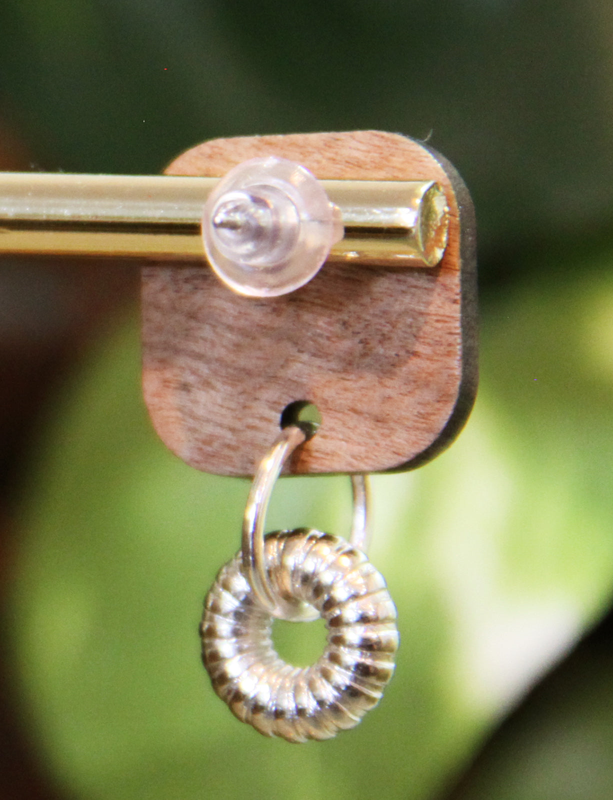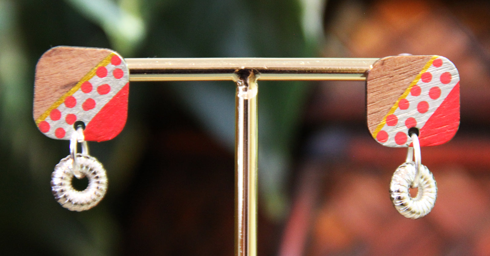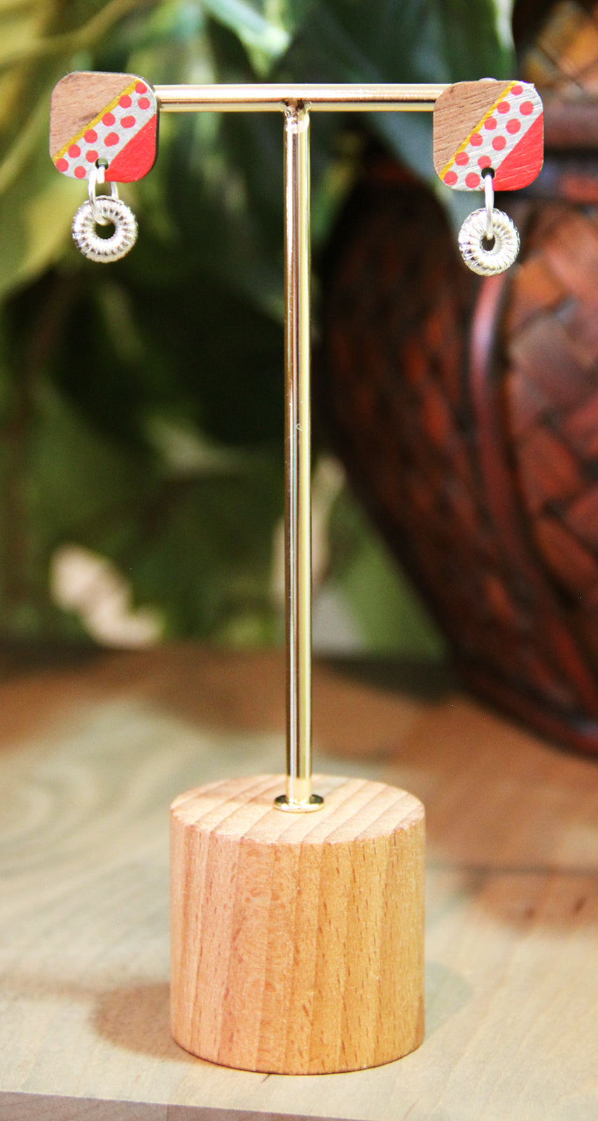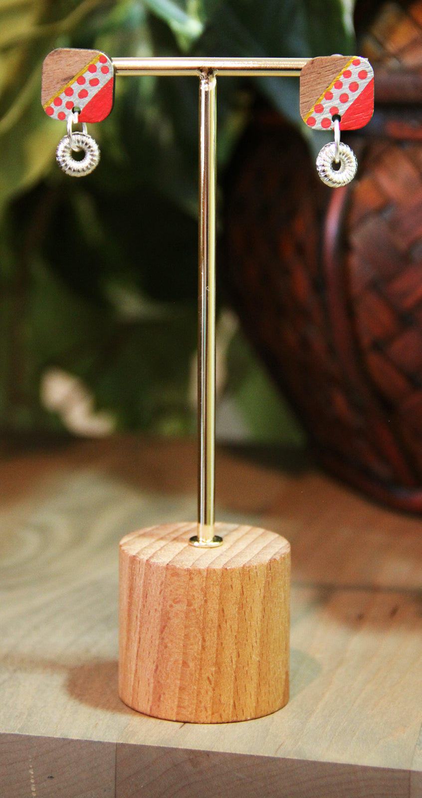 Light weight handmade earring with classical retro linear design. Red, silver and gold colors accentuate the warm wood tones. Small silver flower bead dangling at the bottom creates a fun look. These earrings are artistically playful. The back side is the bare wood as to provide contrast. There will be slight variations in the painted pattern as each piece is hand crafted. These are fun 'little' addition to your daily wear!