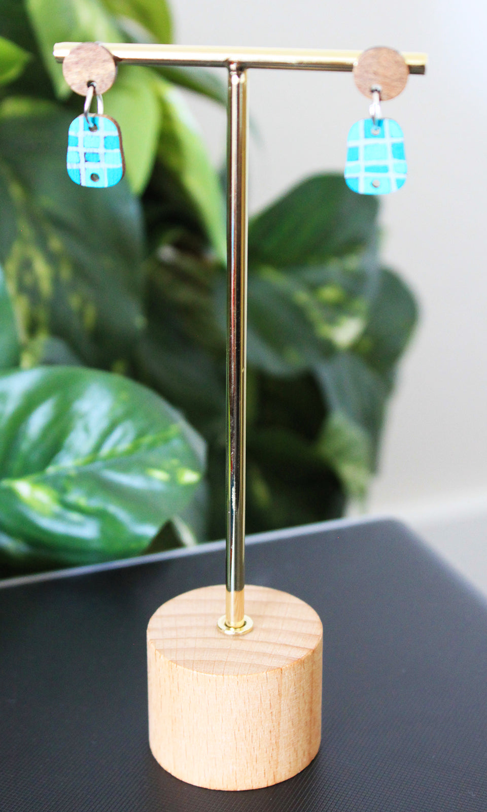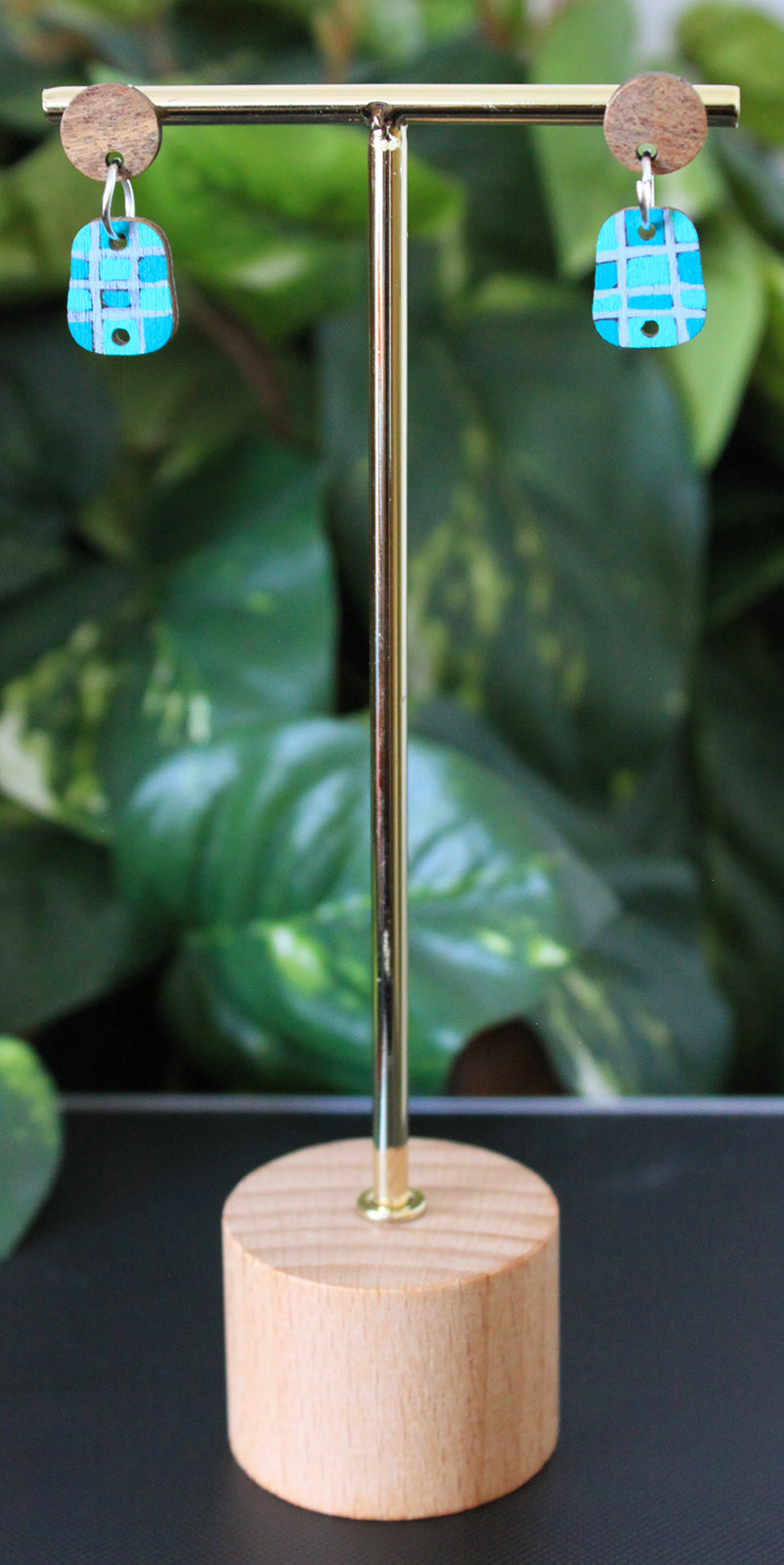 Light weight handmade earring with painted geometrical design - bluish hues with silver lines painted in abstract checkered design. These earrings are artistically playful. The back side is painted turquoise as to provide contrast. These are fun 'little' addition to your daily wear!
