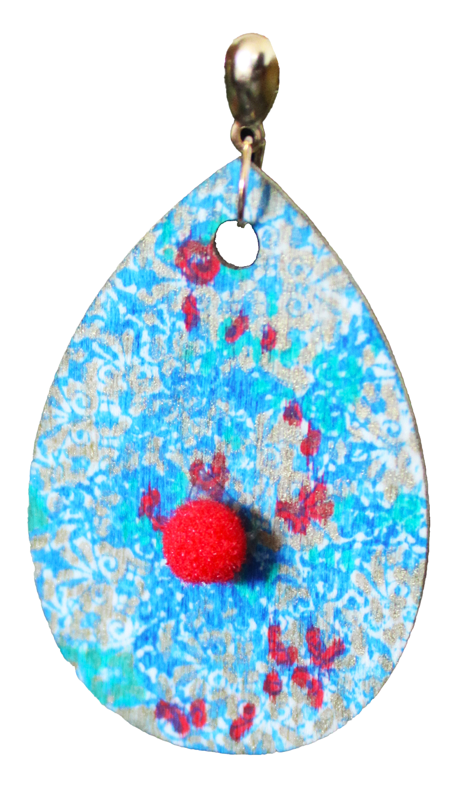 Light weight handmade earring with filigree pattern. Blue, white and gold hues with red accent create a dramatic look. The back side is painted gold as to provide contrast. The vibrant red colored pom pom adds fun to the daily wear. These are a show-stopper - a great addition to your everyday wear!