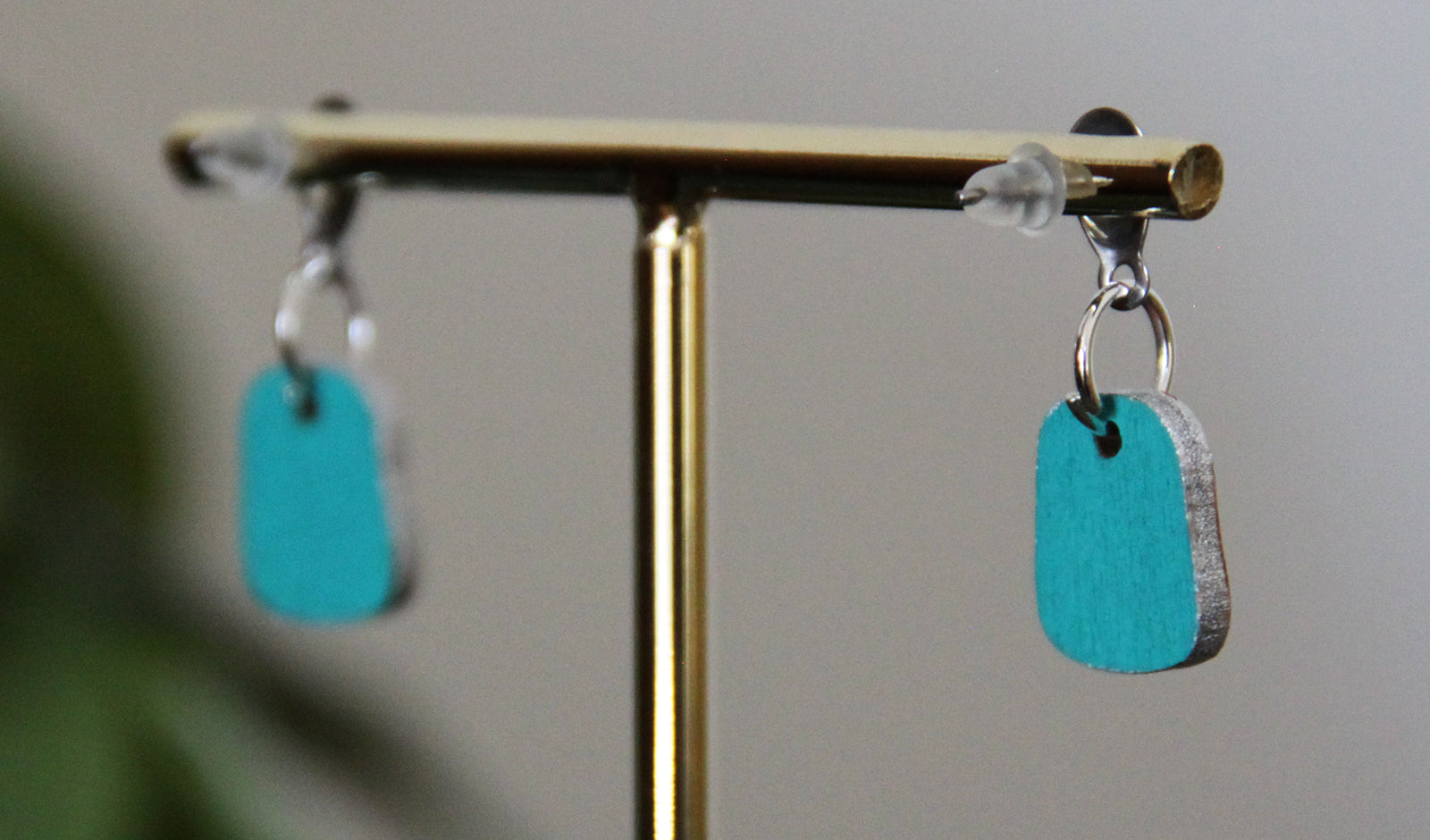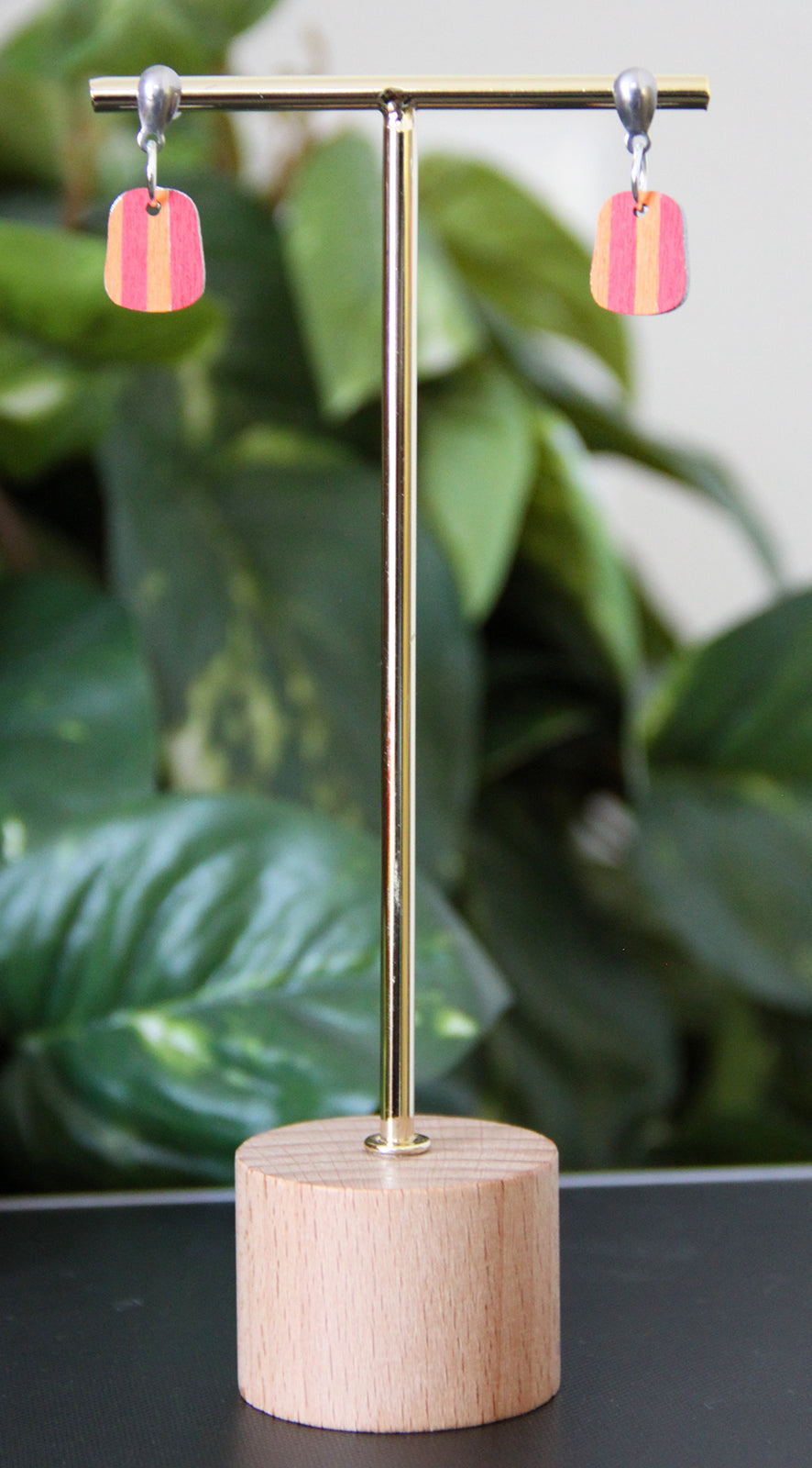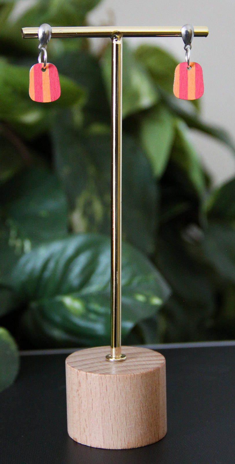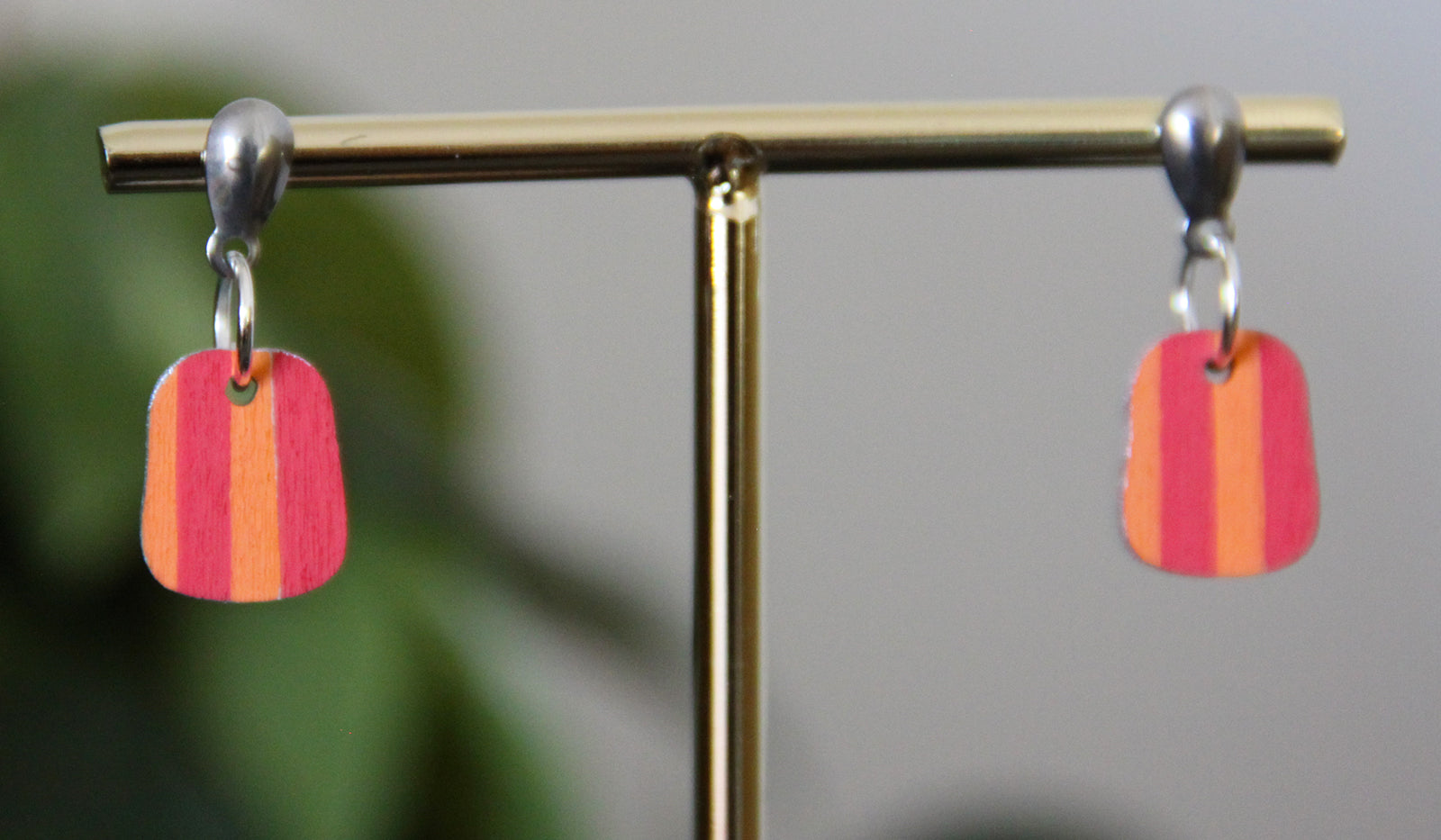 Light weight handmade earring with painted linear design. The red and orange color creates a fun look. These earrings are artistically playful. The back side is painted bright teal as to provide contrast. Edges are painted silver. These are fun 'little' addition to your daily wear!