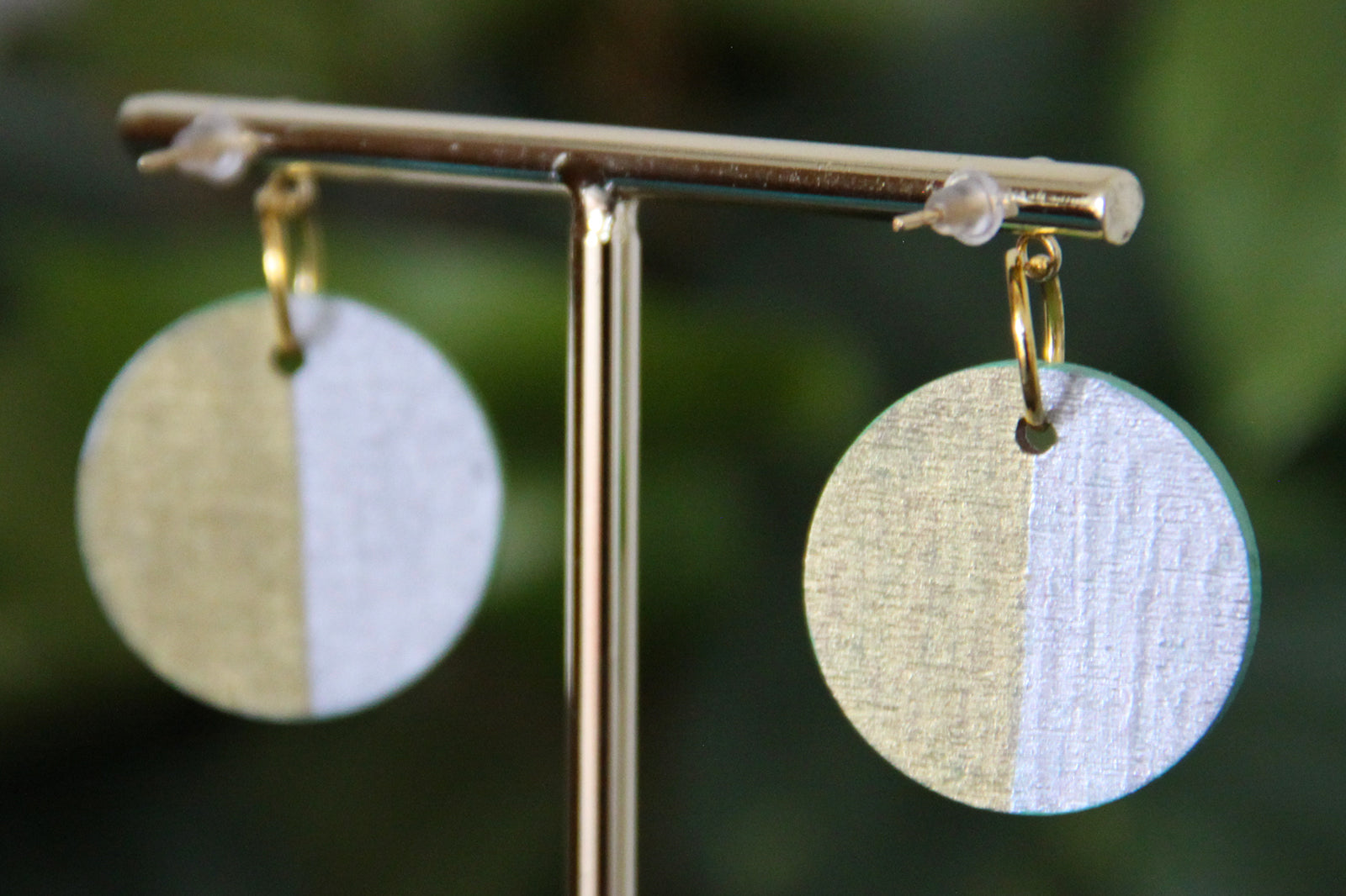 Light weight handmade earring with gold and silver linear design - gold and silver are divided with lime green graphical line. These earrings are artistically playful. The back side is painted gold and silver in linear design. Edges are painted in bright lime green color to provide contrast and a dramatic look. The vibrant green colored pom-pom adds fun to the daily wear. These earrings are a playful addition to your daily wear!