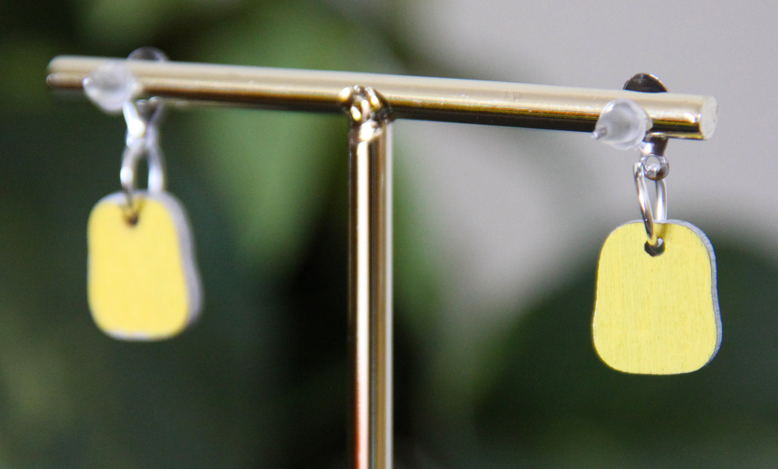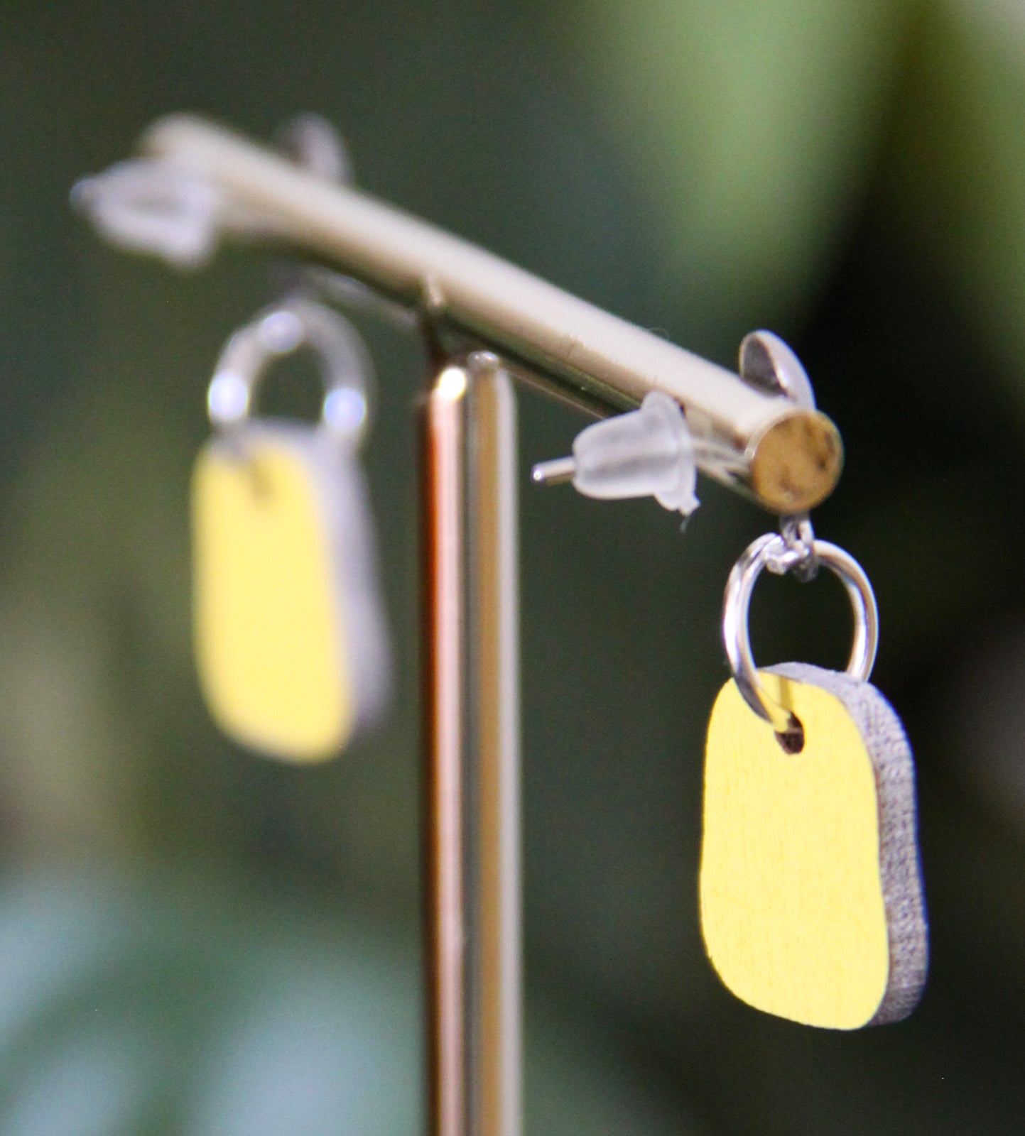 Light weight handmade earring with painted linear design. The blue and teal color creates a fun look. These earrings are artistically playful. The back side is painted bright yellow as to provide contrast. Edges are painted silver. These are fun 'little' addition to your daily wear!