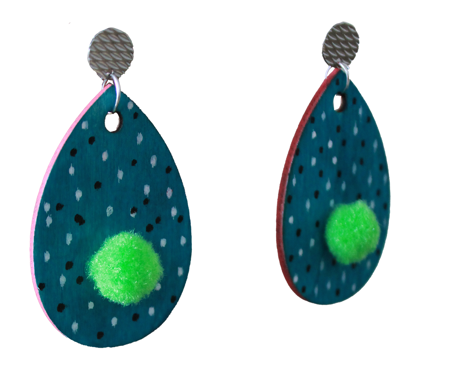 Teal with B&W Polka Dots and Green Pom Pom Teardrop Earrings